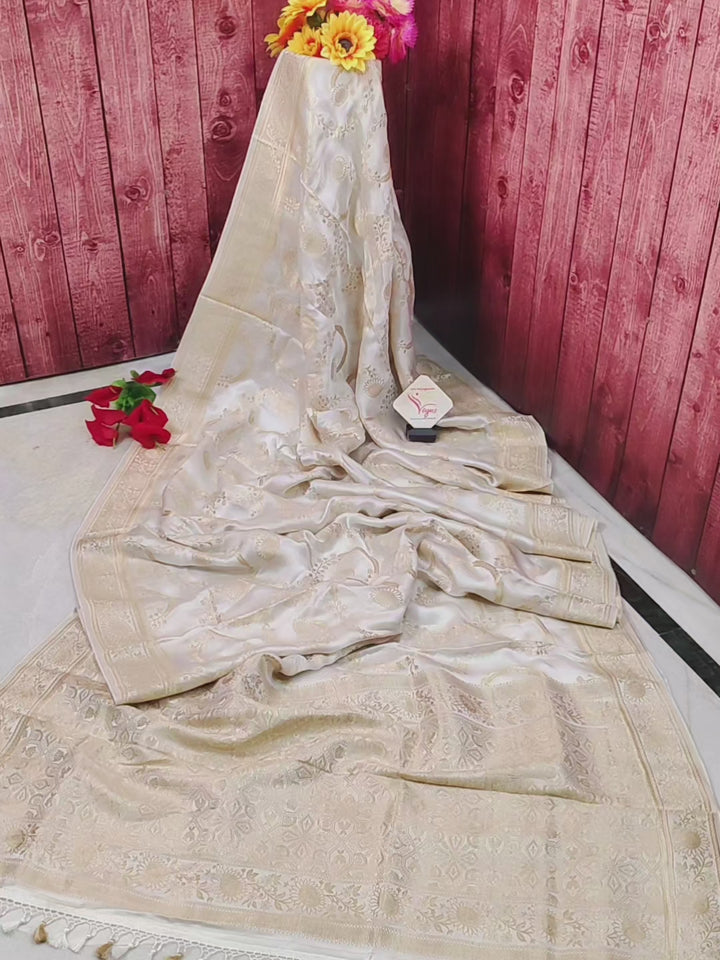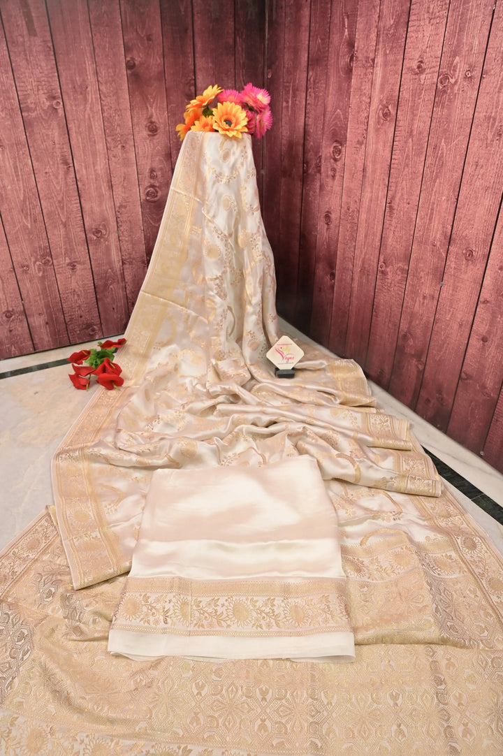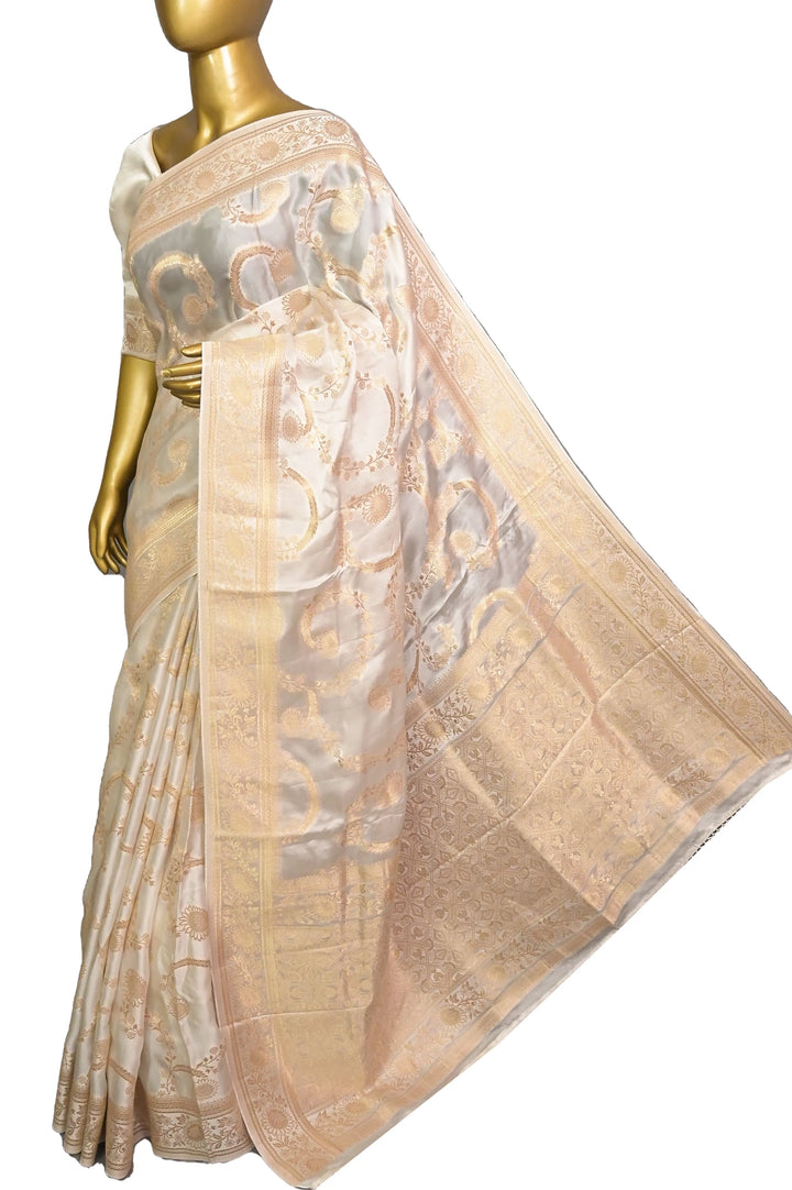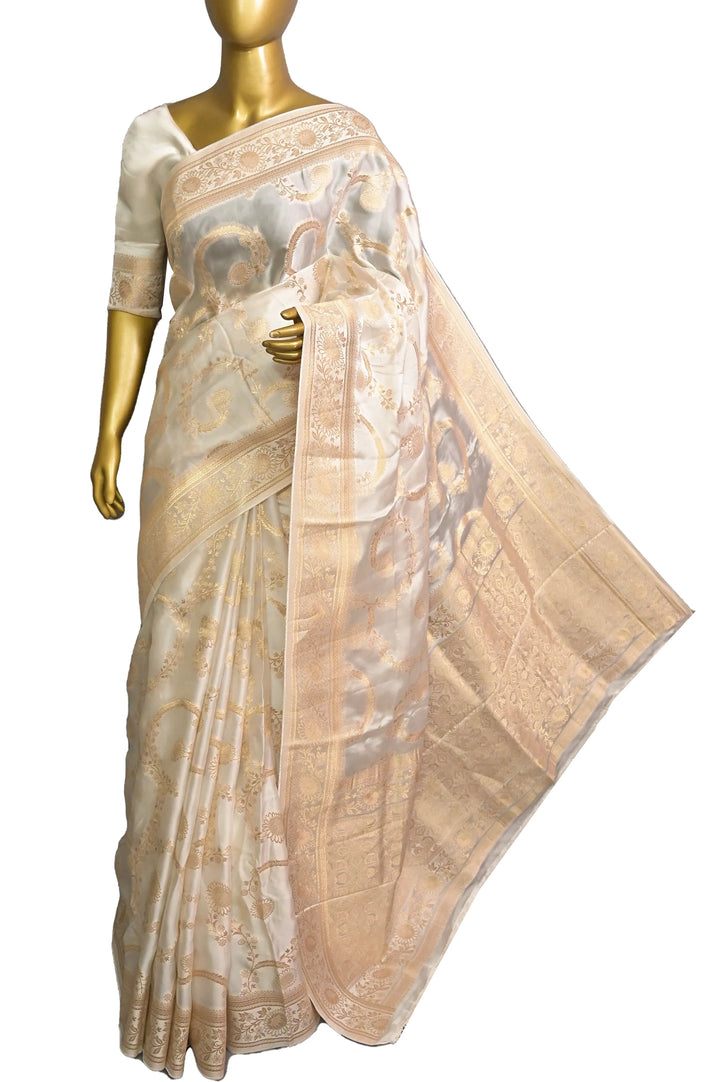 - This is an offwhite color saree with floral golden jaal zari weaving in a floral pattern on the body, pallu, and the border