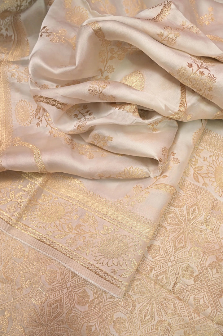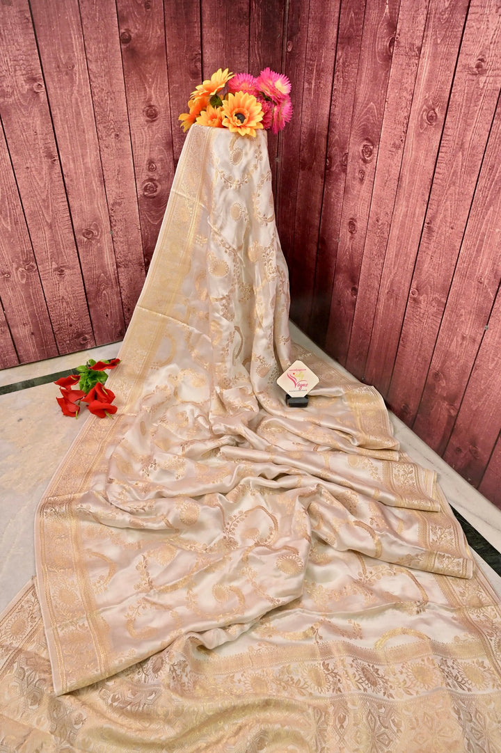 Semi Mashru Silk Saree in Offwhite Pink Color Golden Jaal Zari Weaving Work