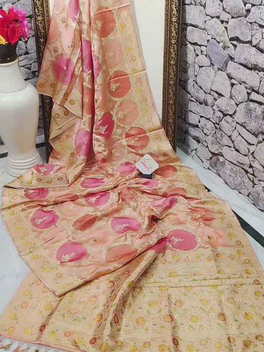 - This is a peach and onion pink color saree with floral meenakari jaal weaving work in a floral pattern on the body, pallu, and the border