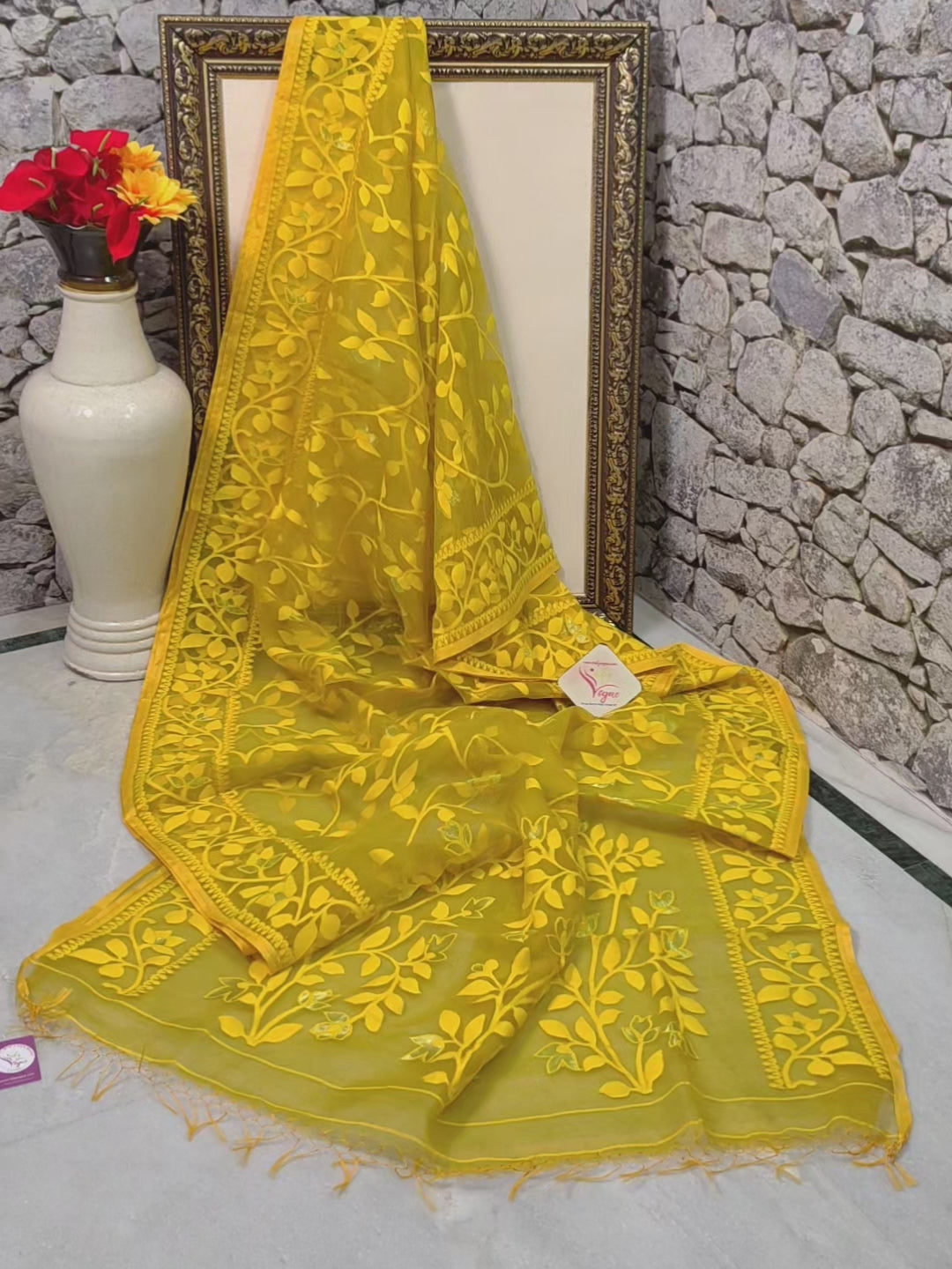 Drape yourself in sunshine with this Semi Muslin Saree in marigold yellow — a color that feels just like the golden hours of a Bengali afternoon.