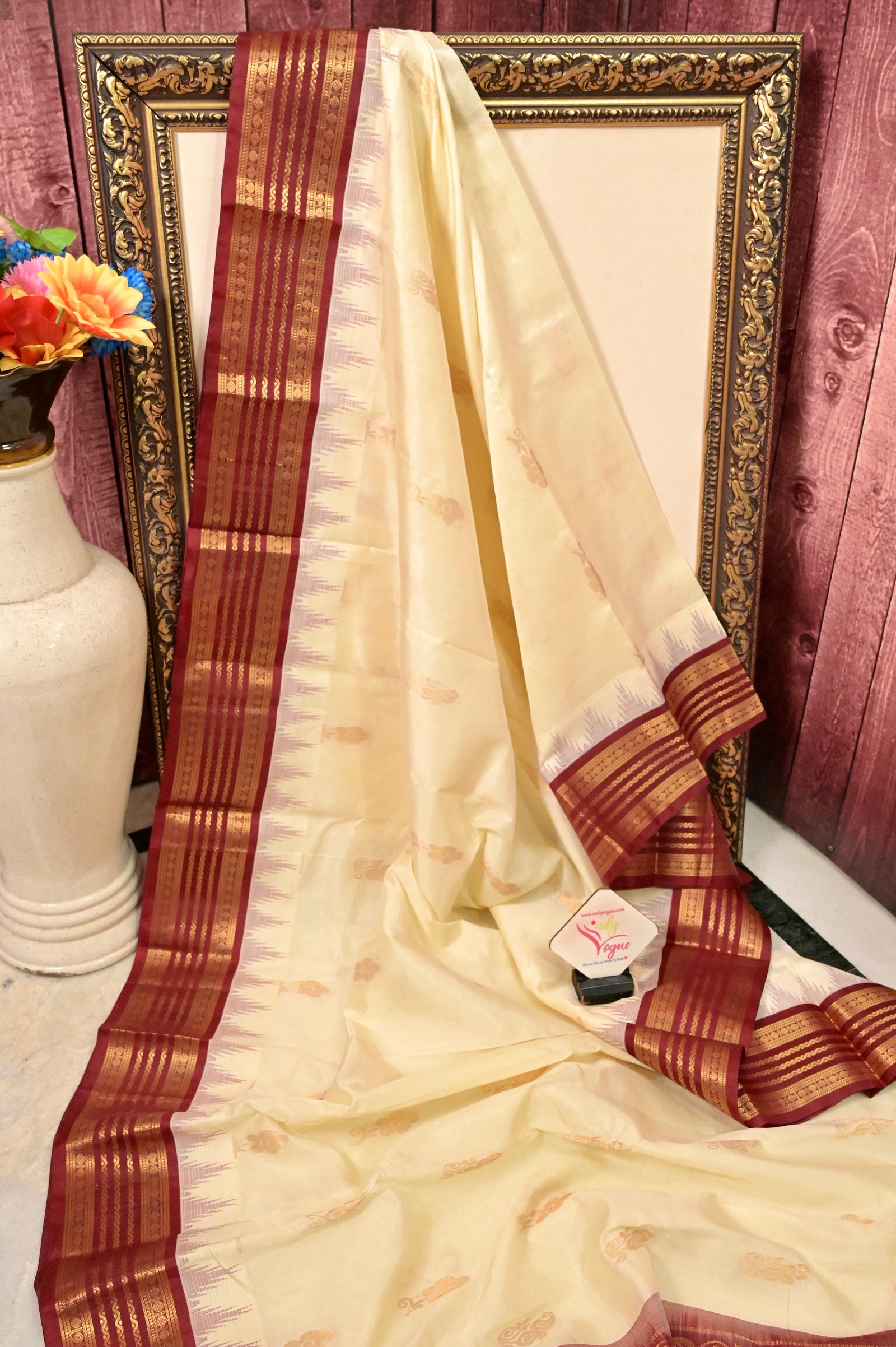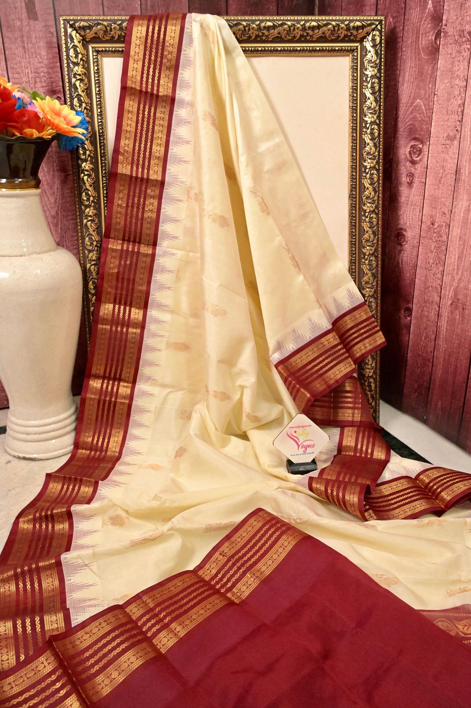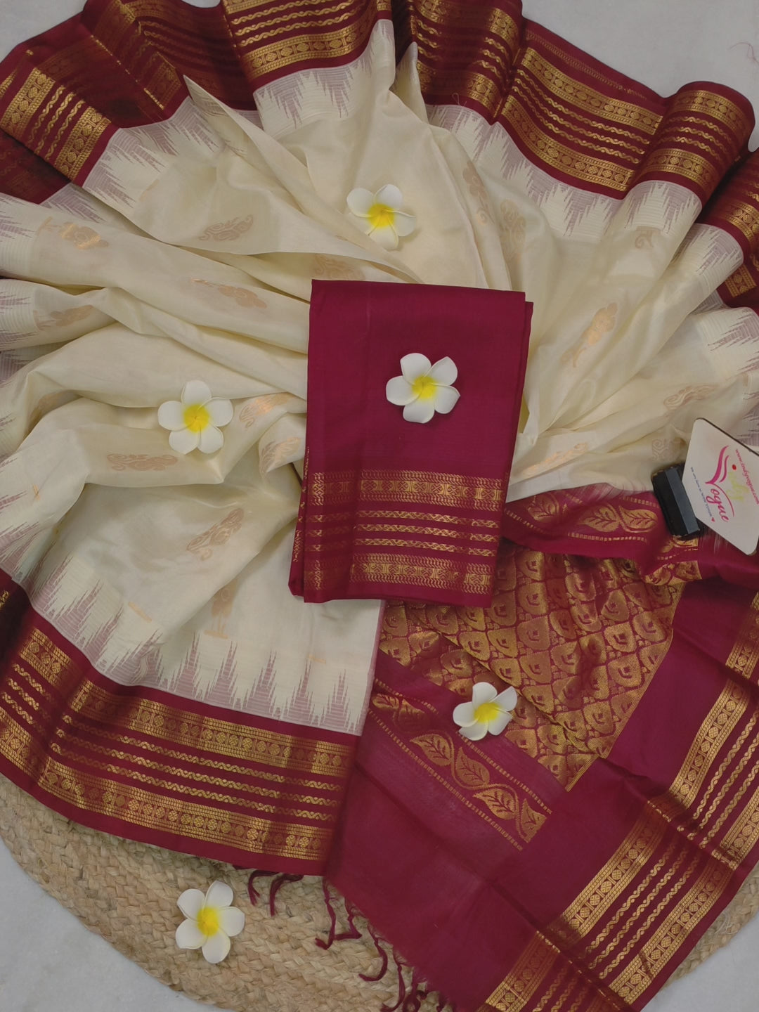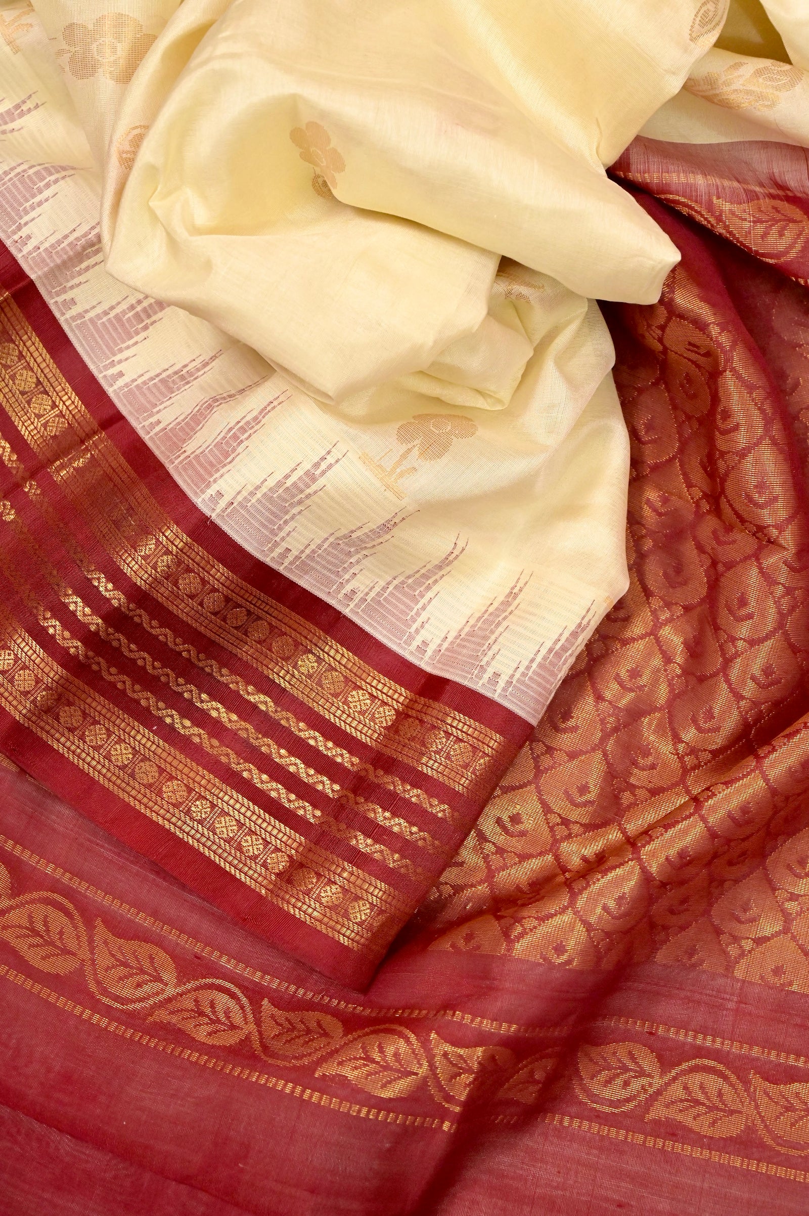 Discover timeless elegance with our Cotton Kanjeevaram Silk Saree in a striking offwhite and maroon combination, where tradition meets refined craftsmanship. The saree features exquisite all-over golden zari butta, each intricately woven with floral motifs forming a unique and eye-catching pattern that adds depth and texture to the drape.