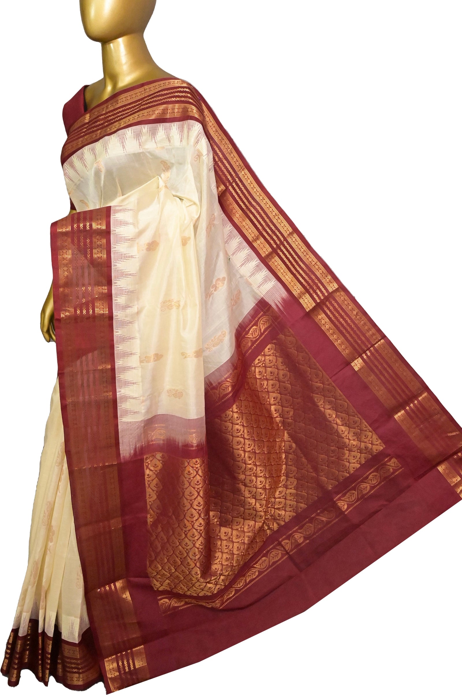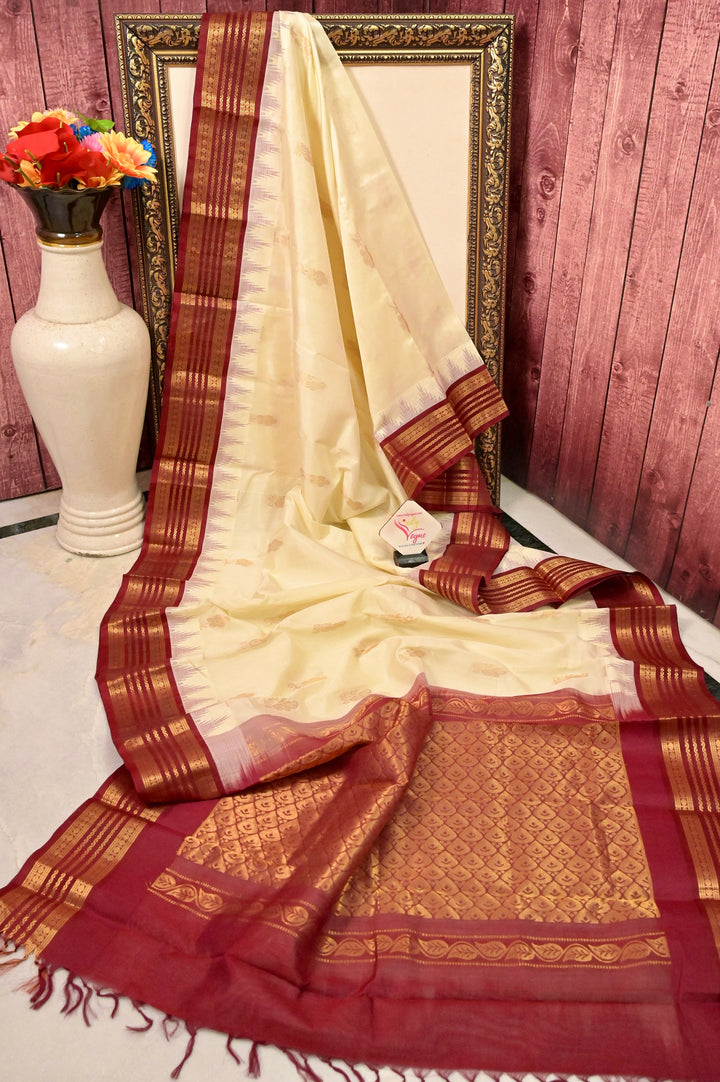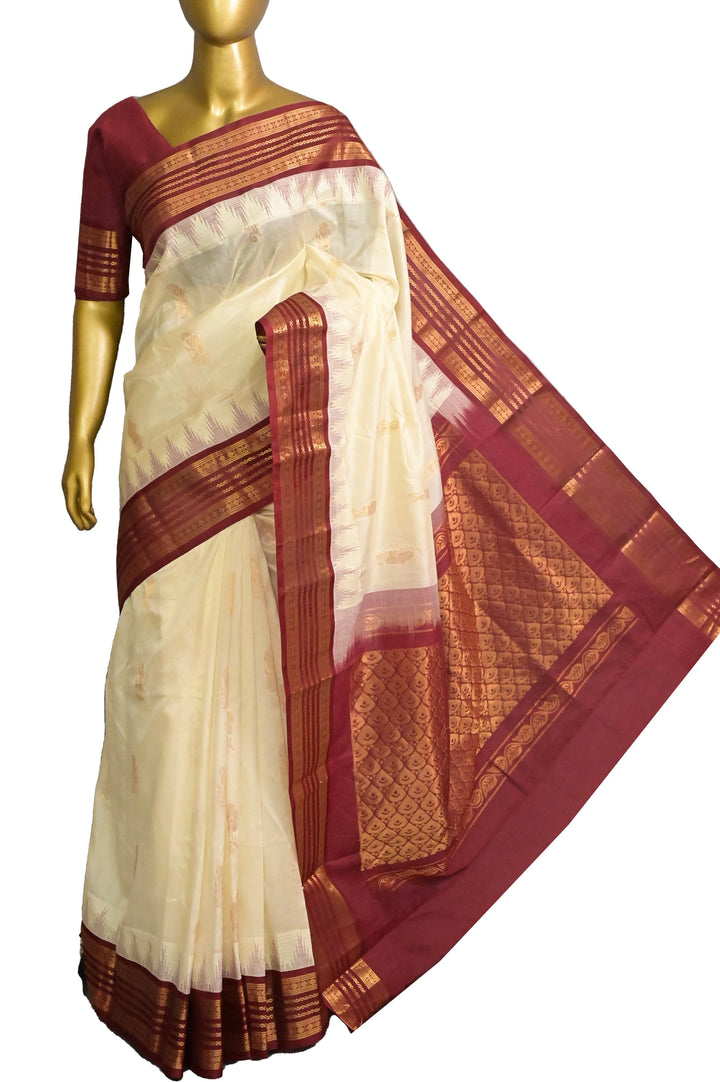 Sico Kanjeevaram Silk in Offwhite and Maroon Color with Allover Golden Butta and Kanchi Border