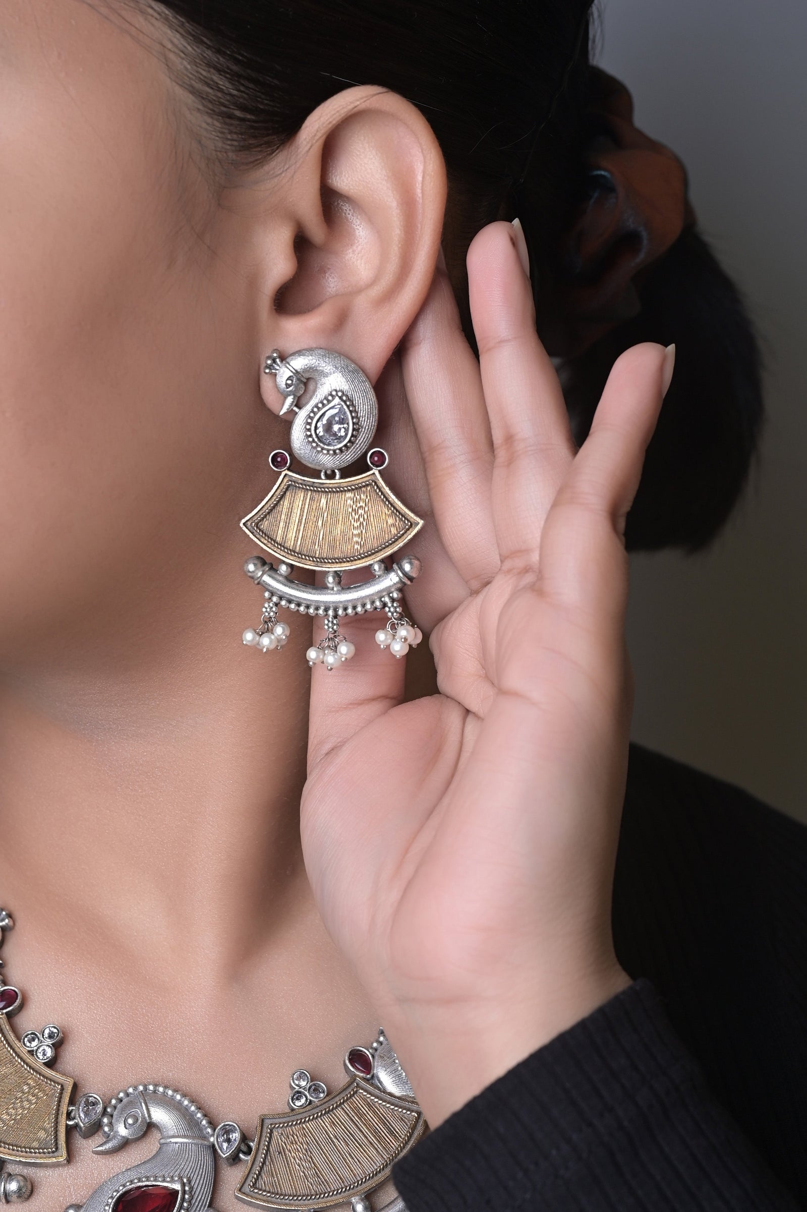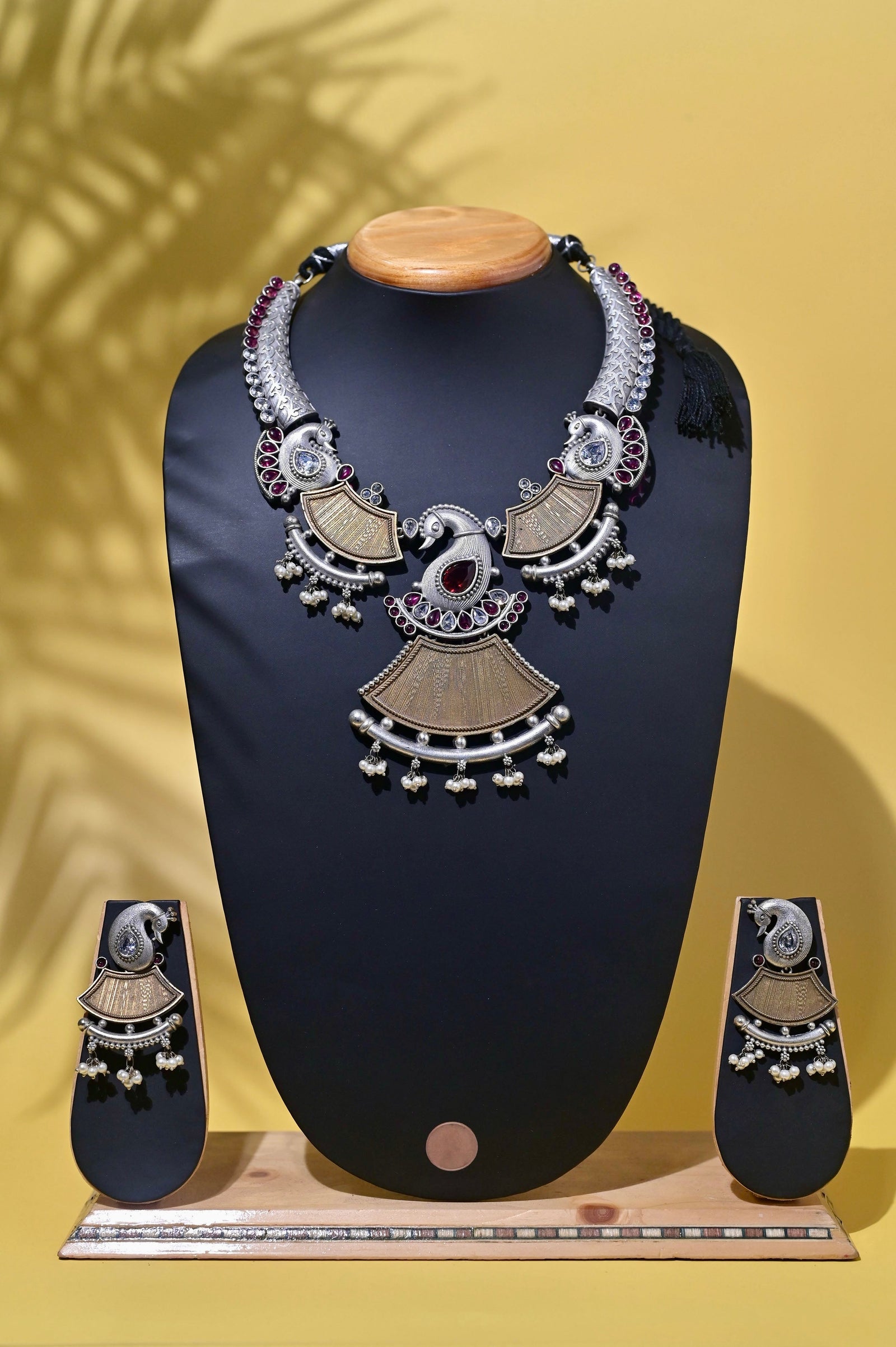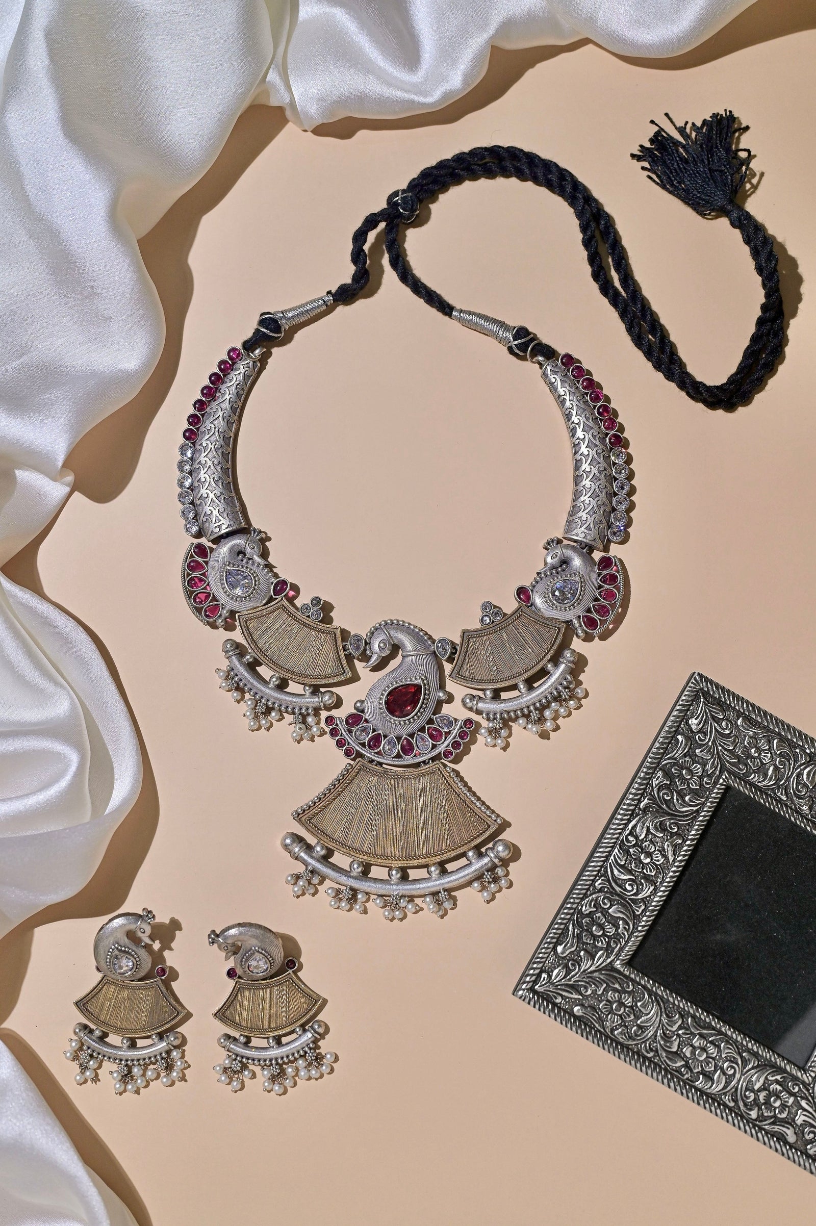 Just perk up your accessories to the next level with the new collection of silver and golden dual-tone metal collar necklace set made of Monalisa stonework and embedded American Diamond stonework. It comes with matching big peacock designed statement-style jhumkas. The penny is kept aside to make you understand the real size of the object.