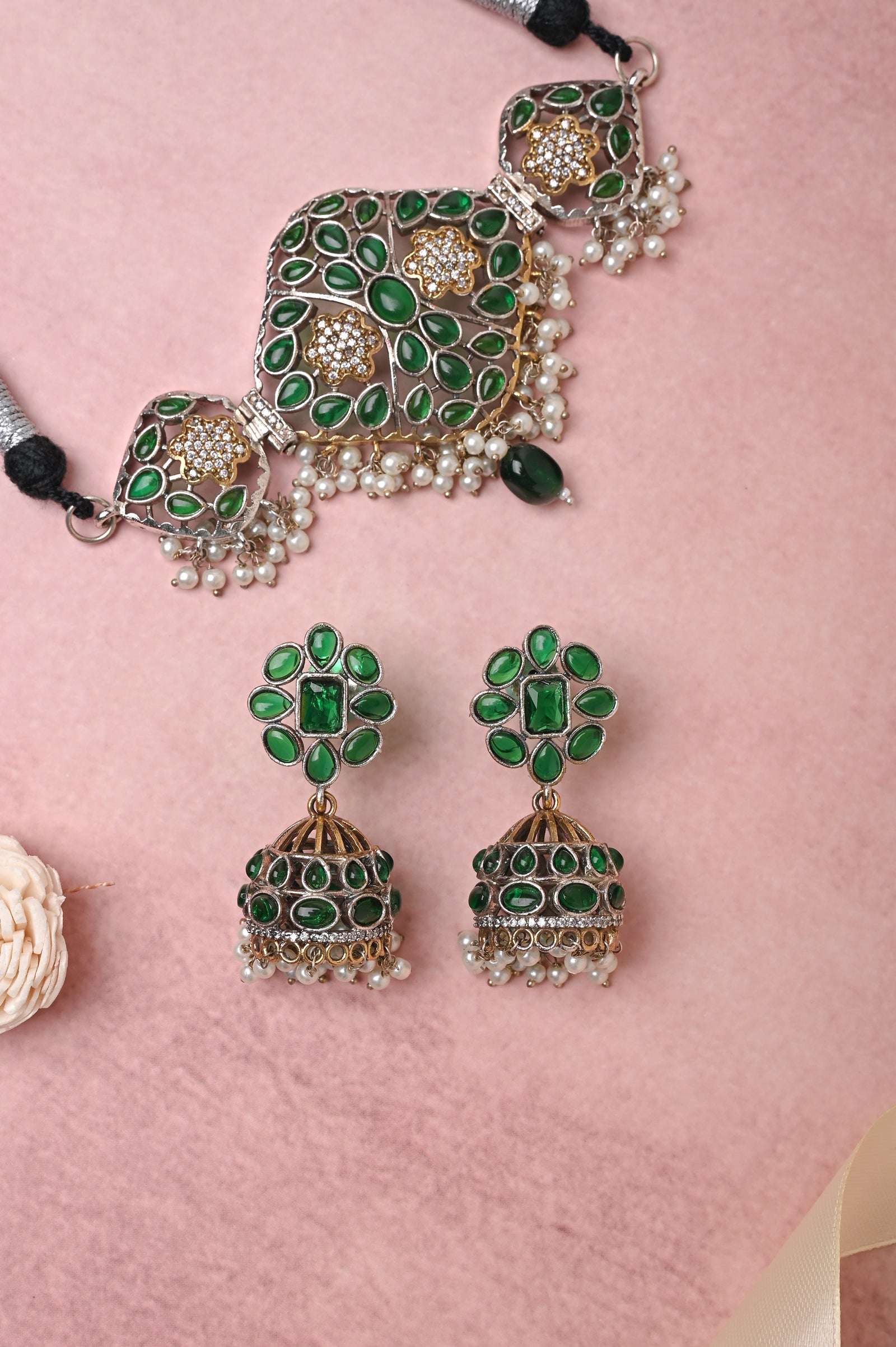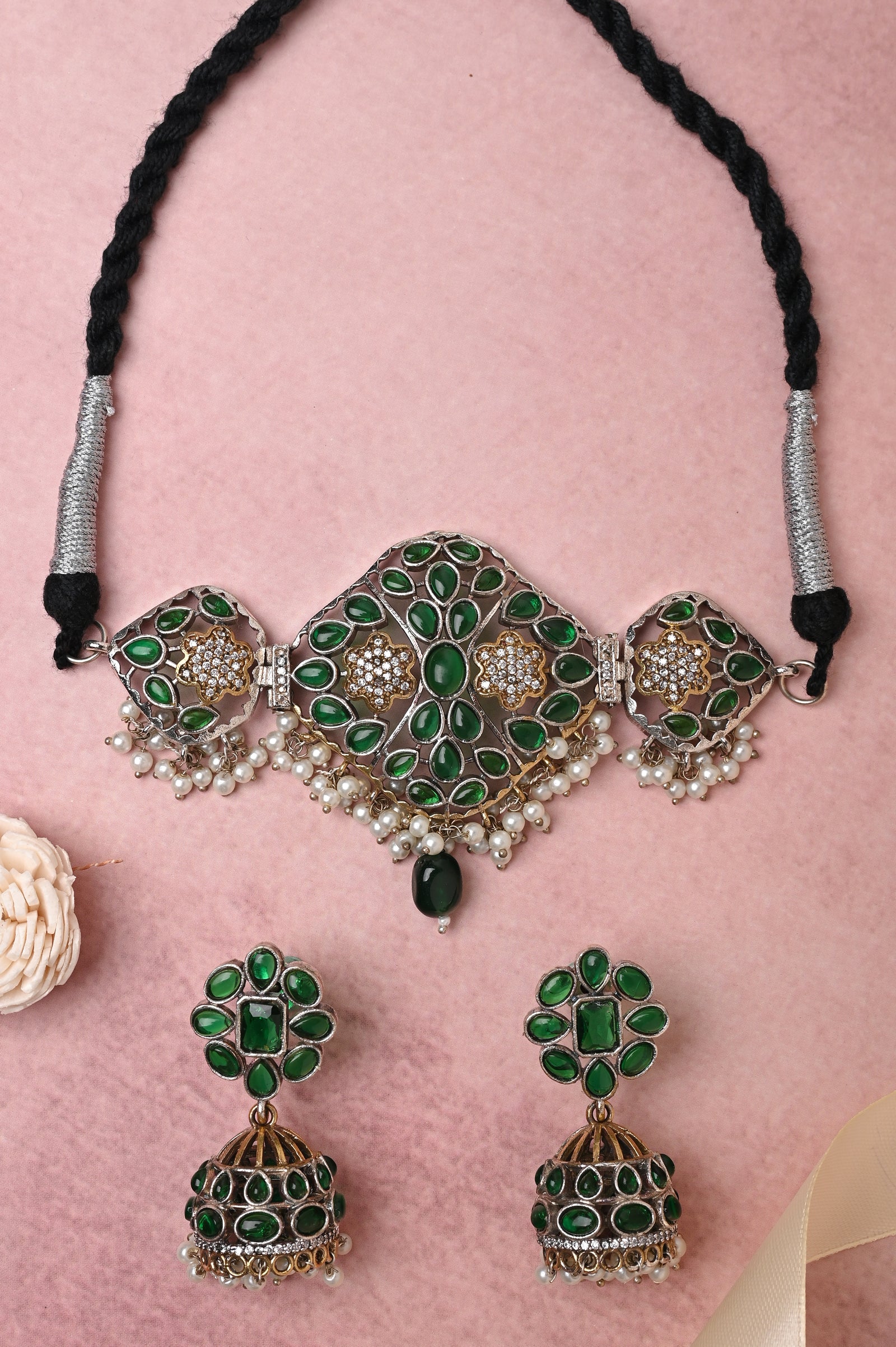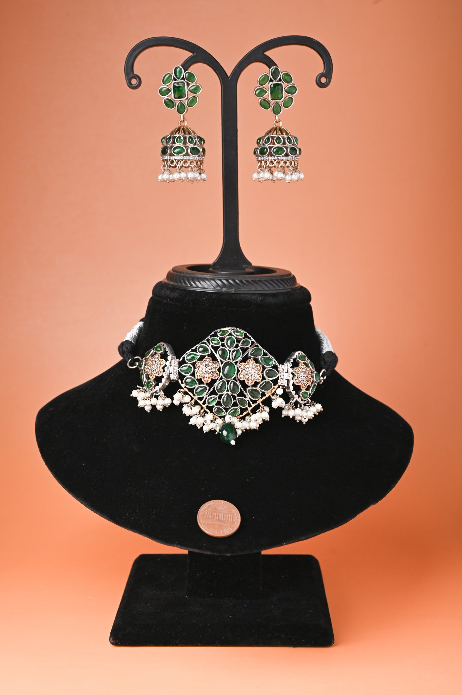 Shine like a star with our silver and golden dual-tone choker necklace set! Featuring a stunning Monalisa stone in green and an AD stone in transparent, this necklace set will surely impress. With a unique moti bunch hanging from the pendant, it's the perfect blend of elegance and quirkiness. The penny is kept by the side to help you understand the size of the product.