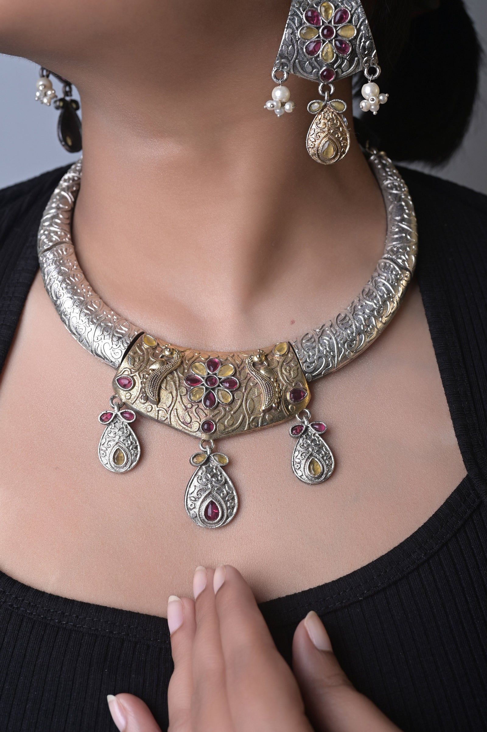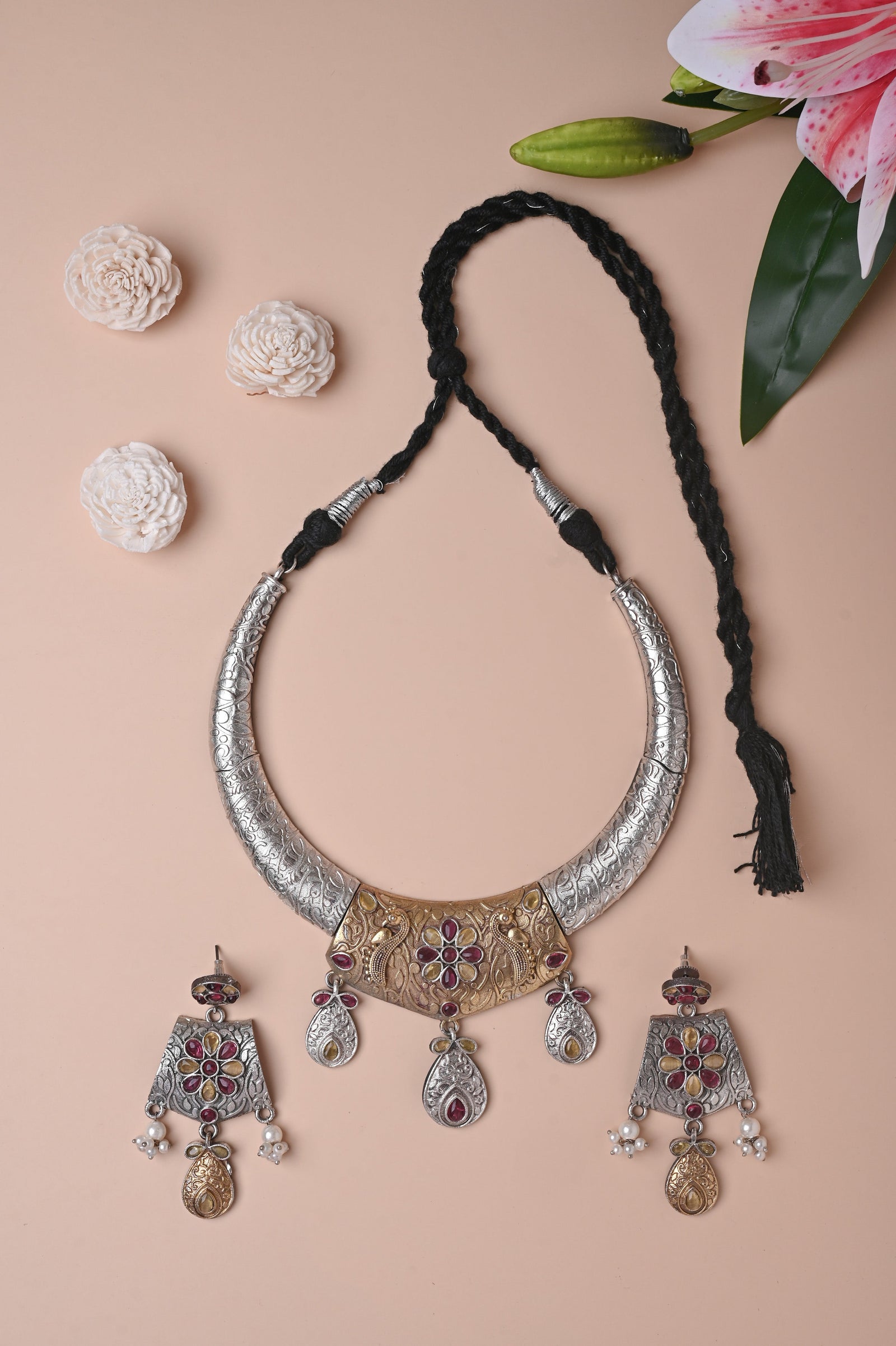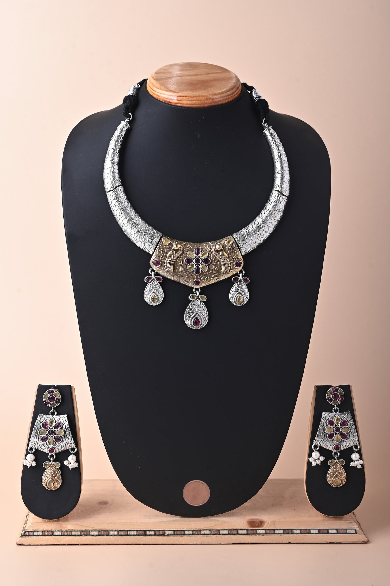 Get to know your accessory look this season with our silver and golden metal combination Hansuli style collar necklace set that comes with Monalisa stonework of dual tone finish, making this collar necklace set in silver one of the eminent purchases and paired with beautiful silver jhumkas beaded with stone. The penny is kept aside to make you understand the real size of the object.