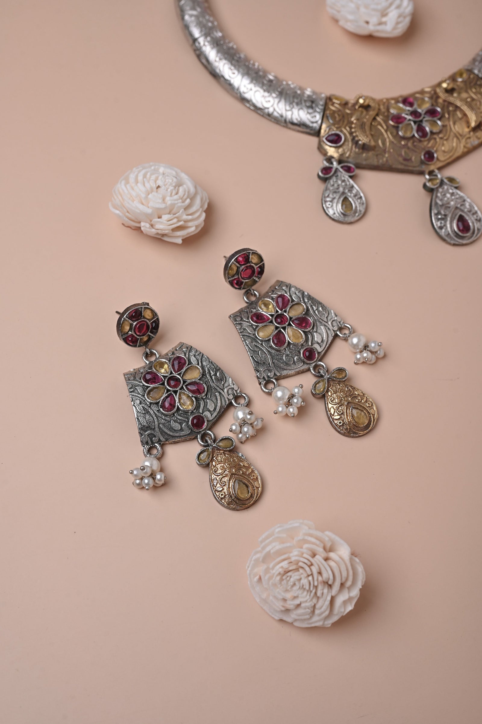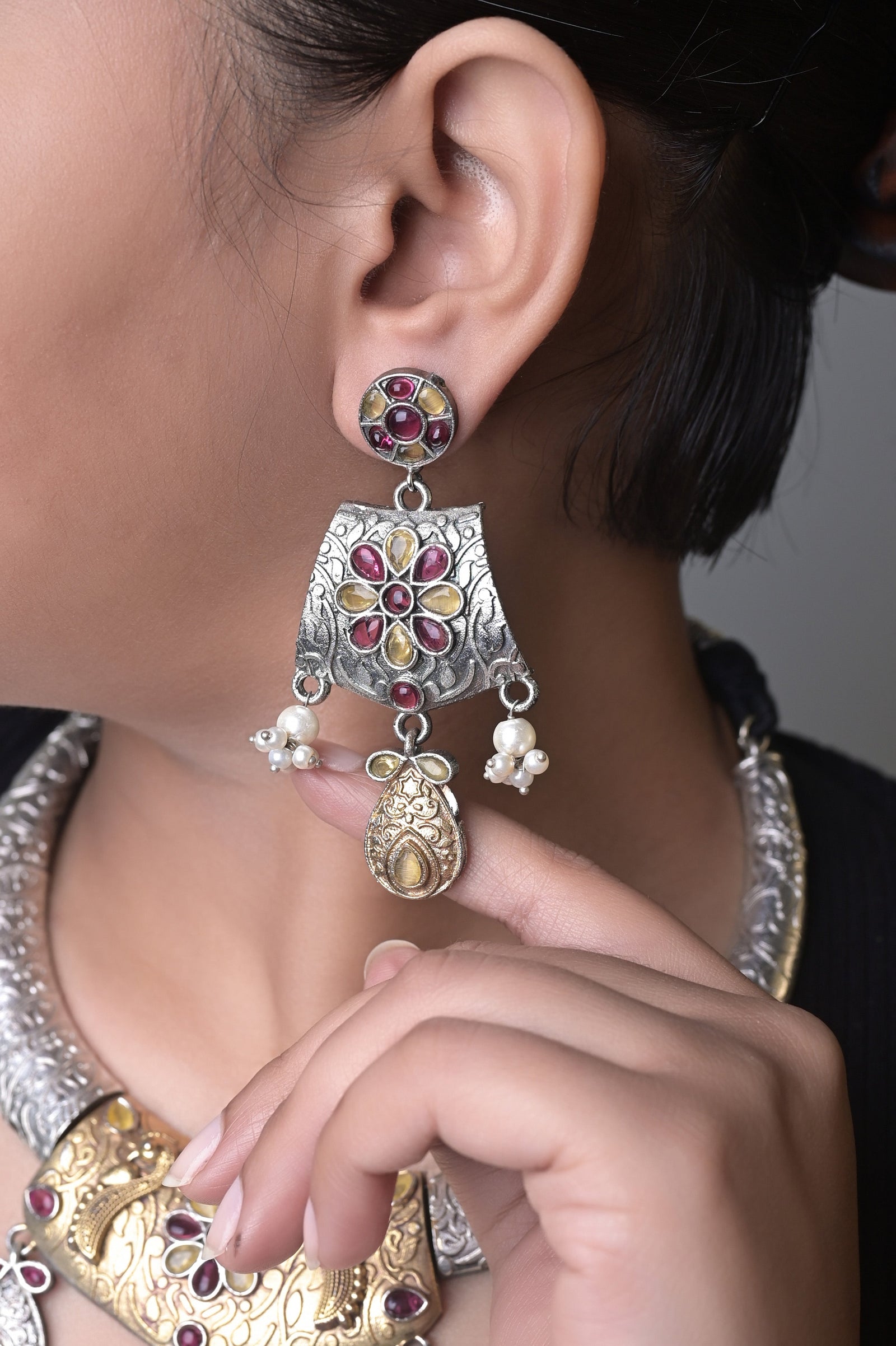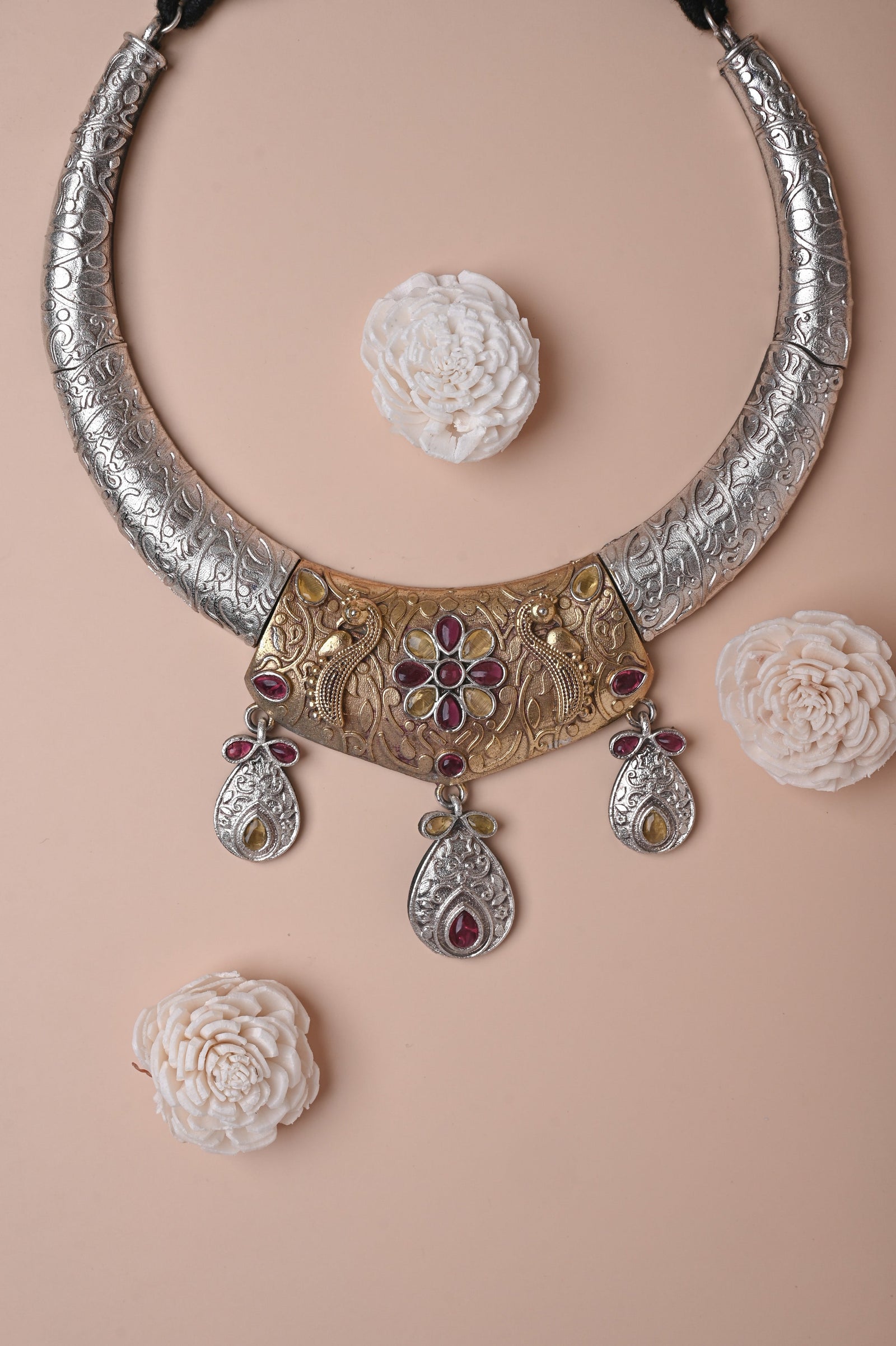 Get to know your accessory look this season with our silver and golden metal combination Hansuli style collar necklace set that comes with Monalisa stonework of dual tone finish, making this collar necklace set in silver one of the eminent purchases and paired with beautiful silver jhumkas beaded with stone. The penny is kept aside to make you understand the real size of the object.