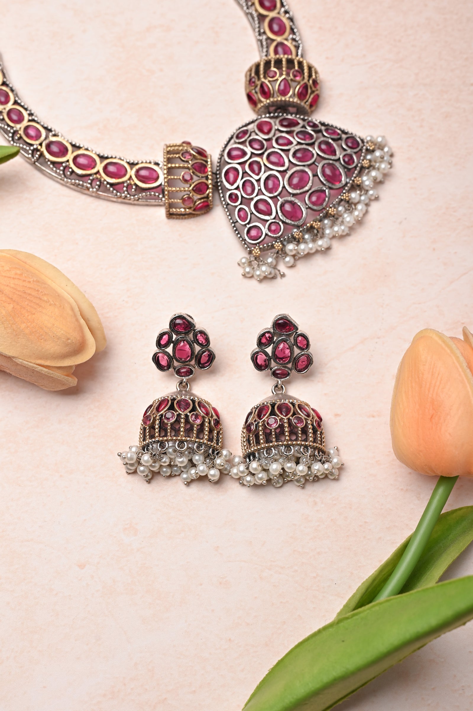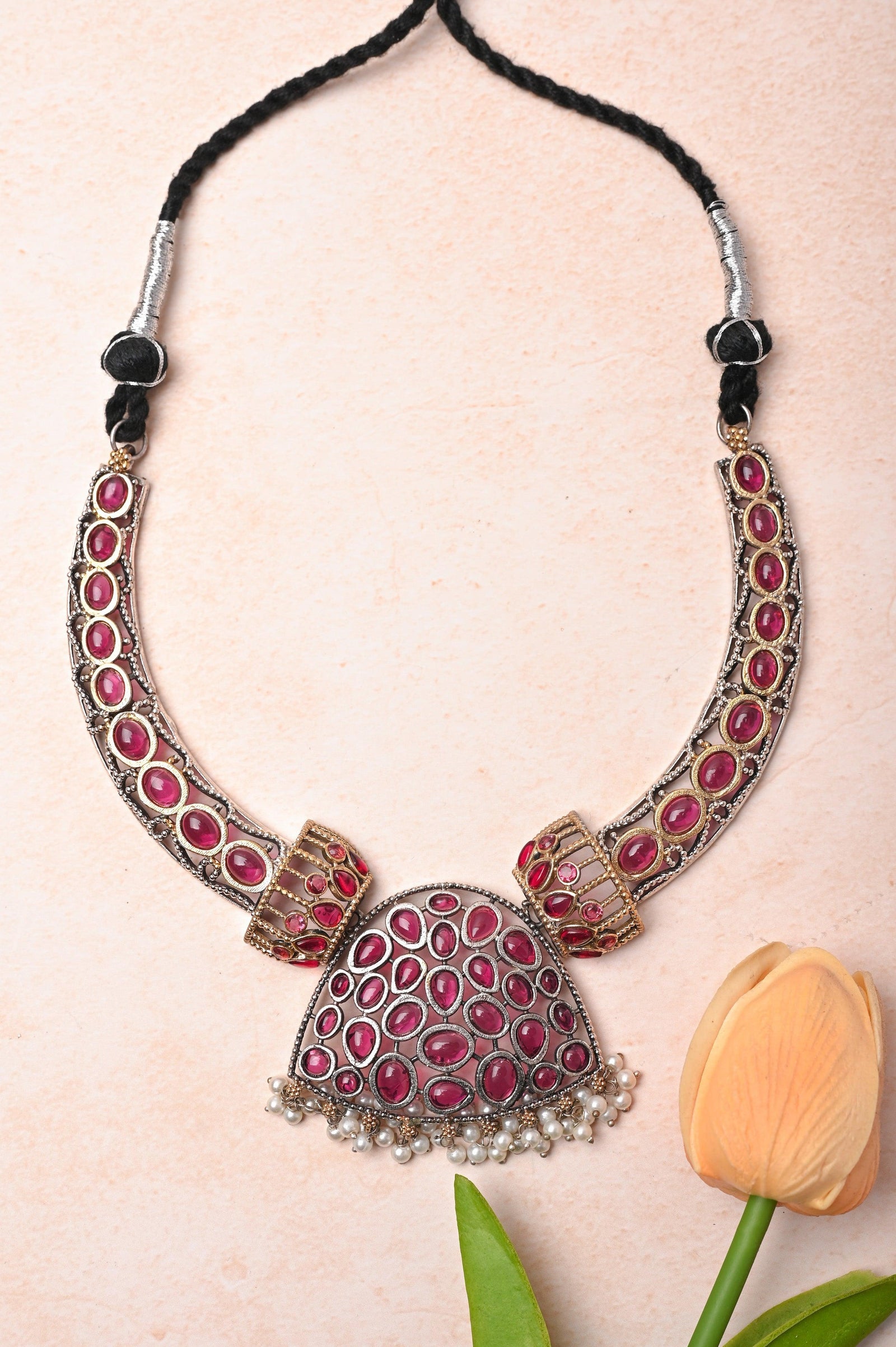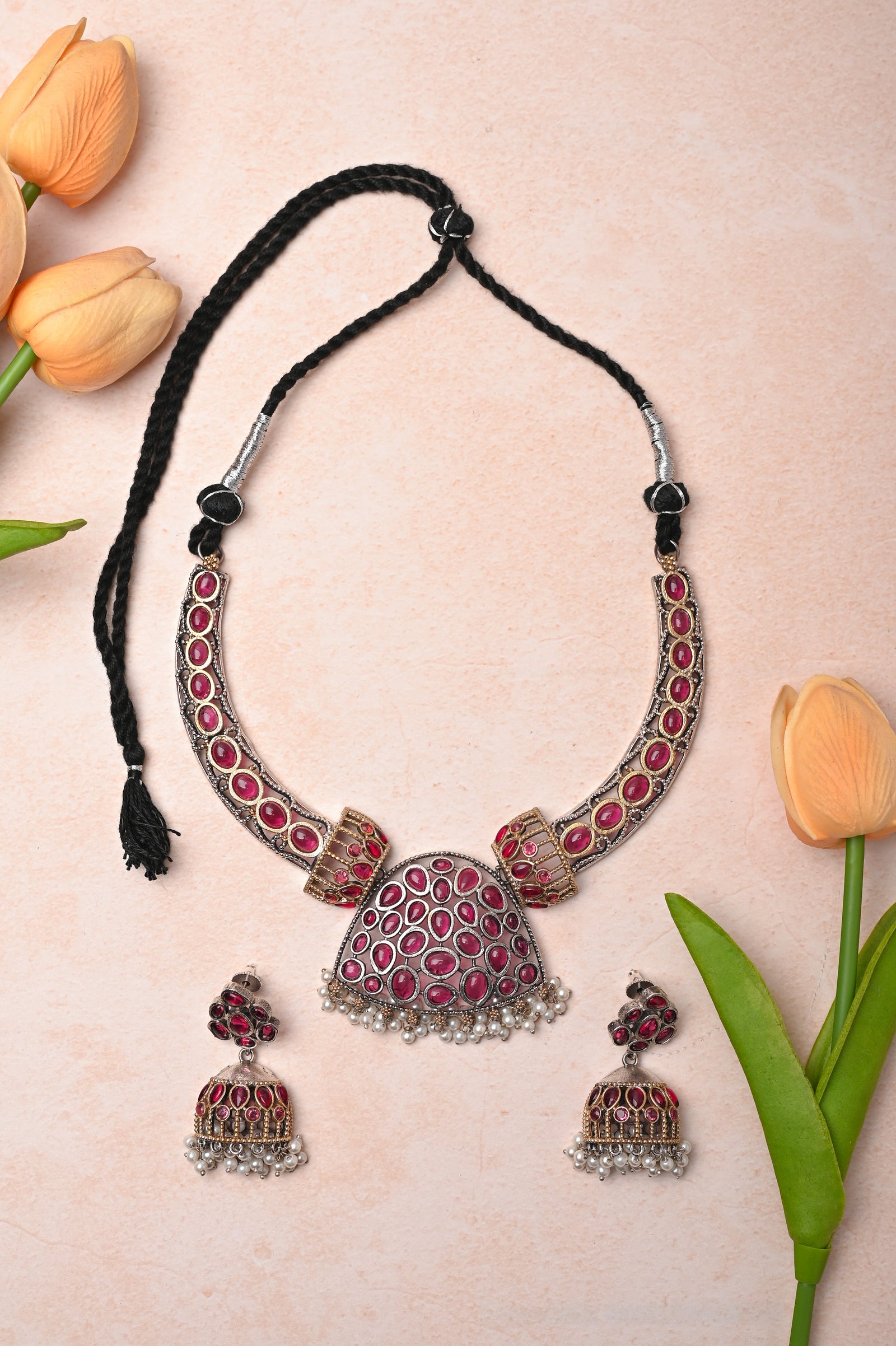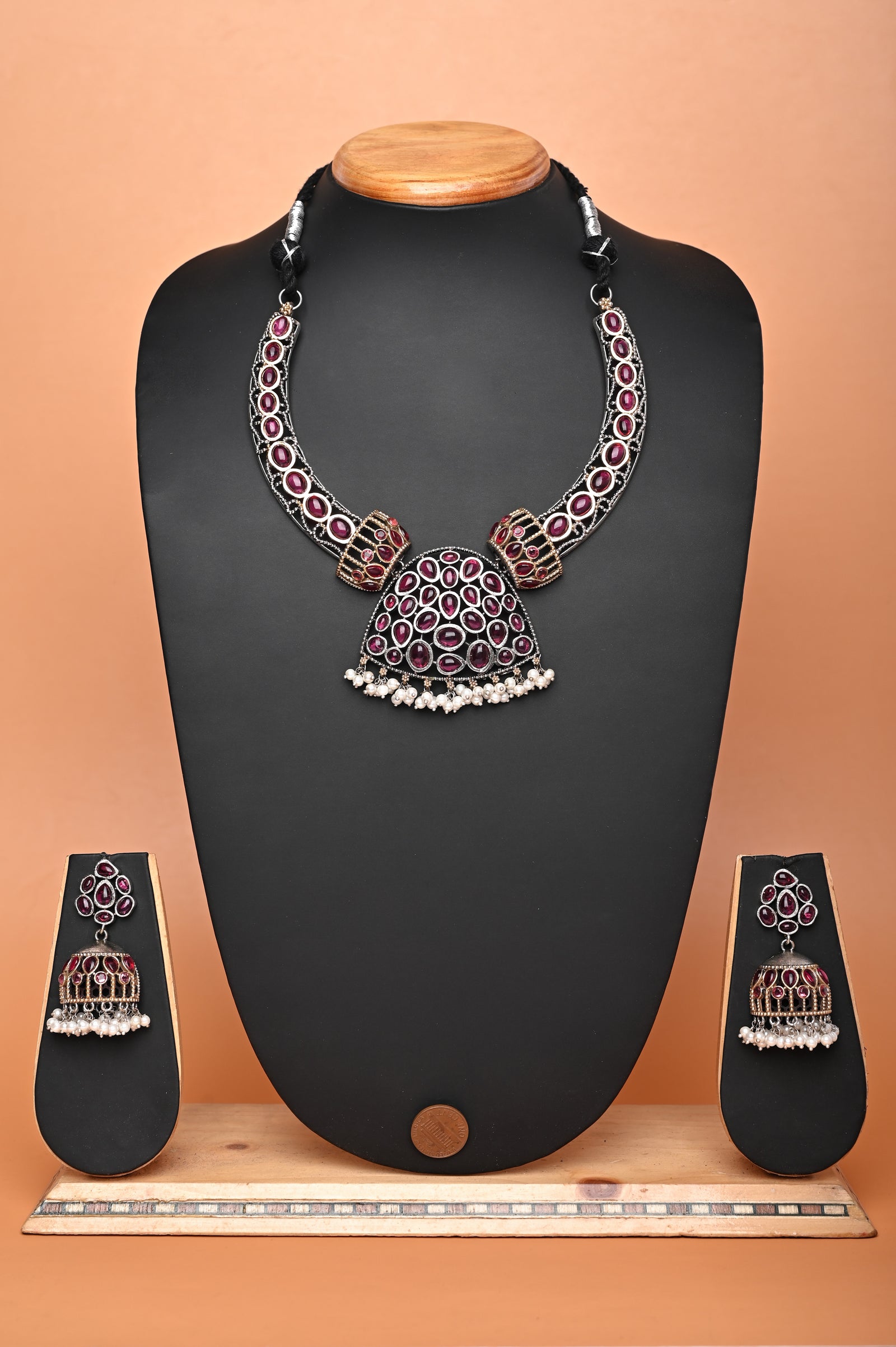Make yourself appear more happening this festive time with our 92.5 silver and golden polish dual-tone jewelry collection. Like this marwar-style long collar necklace set that comes with an all-over curve Monalisa stone work to look appealing. It comes with matching earrings to complete your look. The penny kept beside helps to understand the actual size of the ornament.