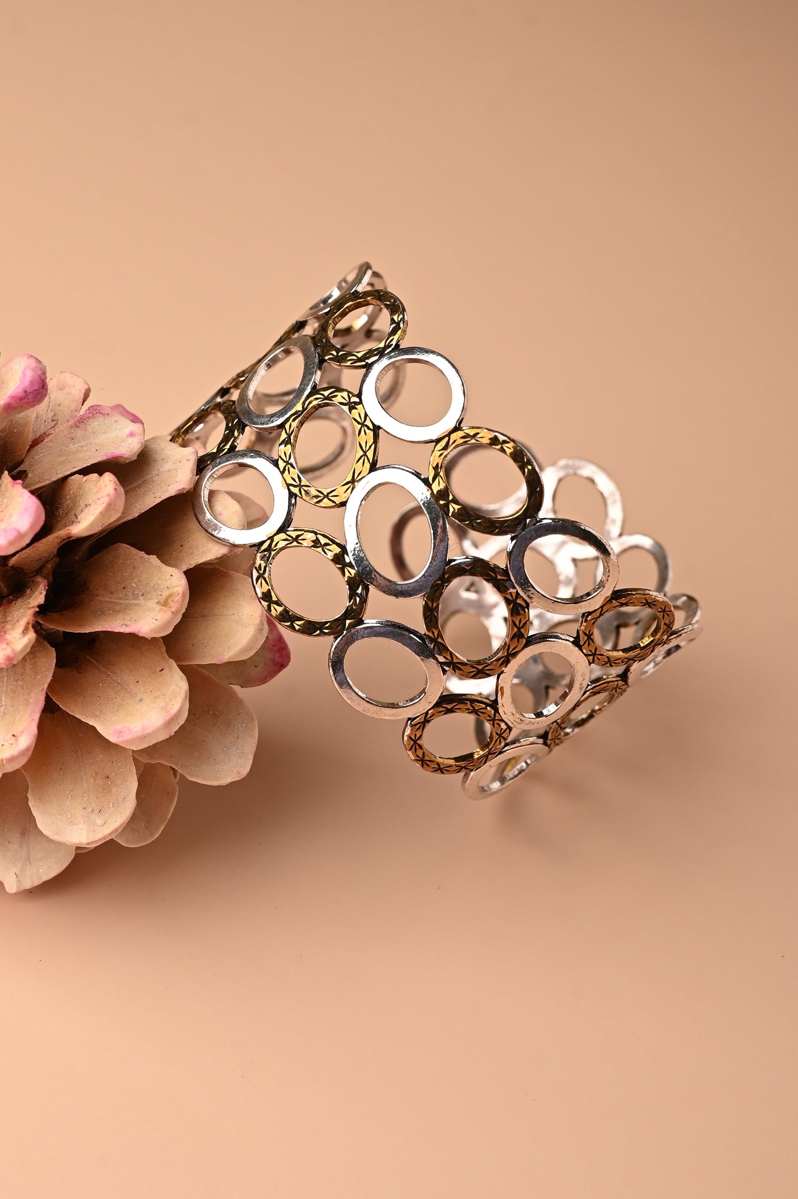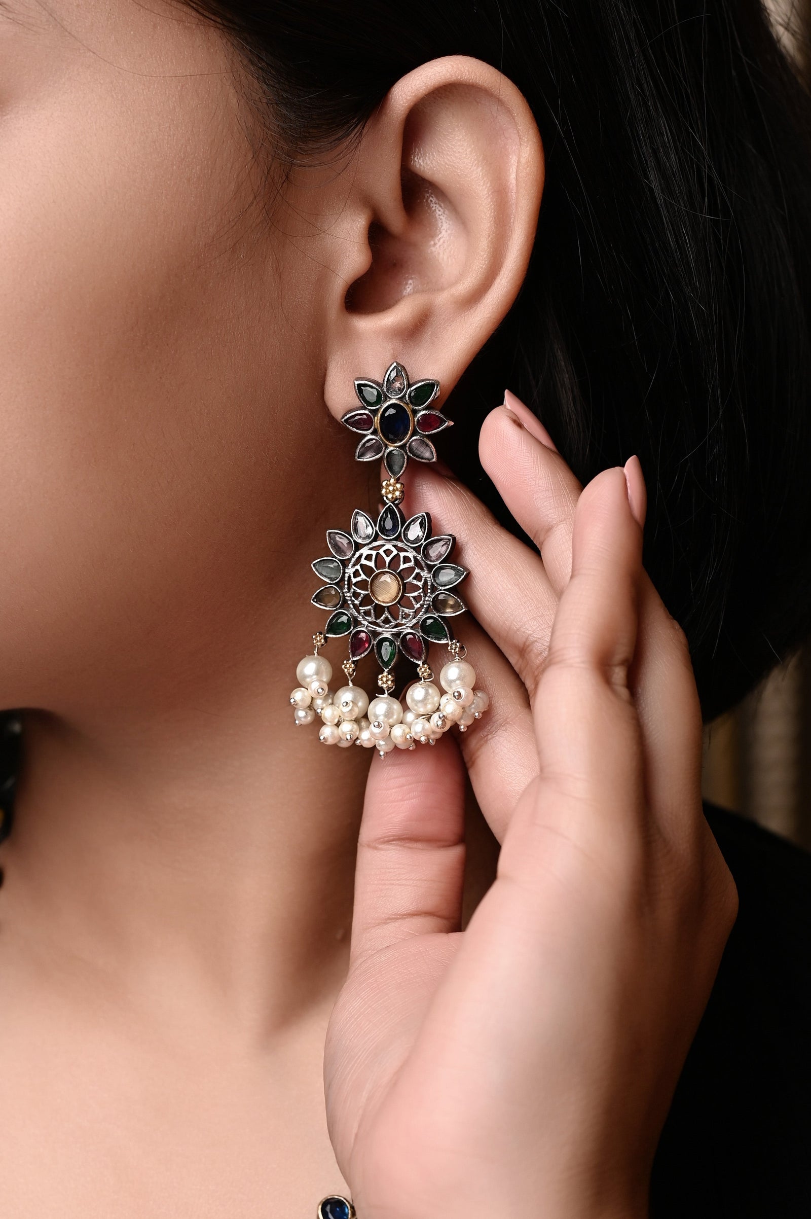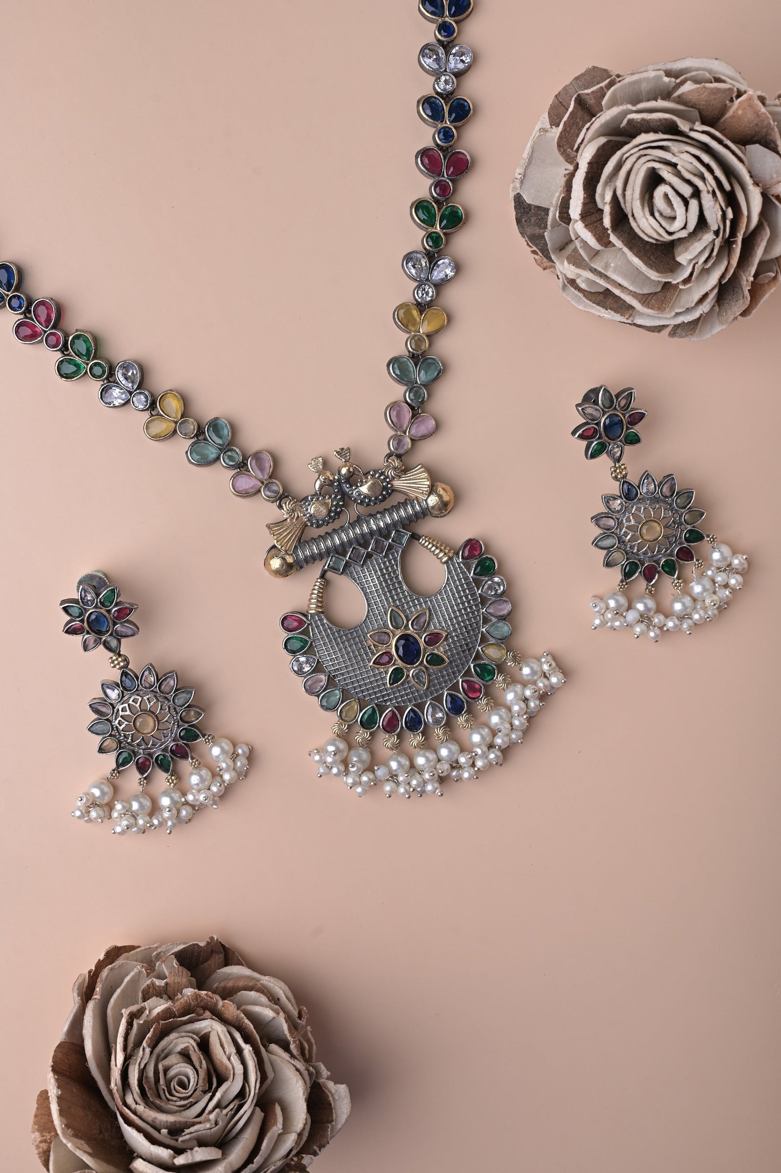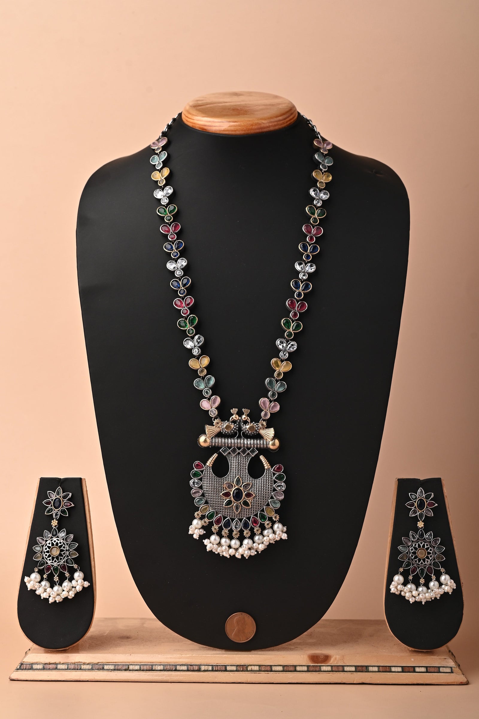 Just perk up your accessories to the next level with the new collection of silver and golden dual-tone metal long necklace set made of multi-colored Monalisa stonework. It comes with matching big statement-style jhumkas with beaded pearl work. The penny is kept aside to make you understand the real size of the object.