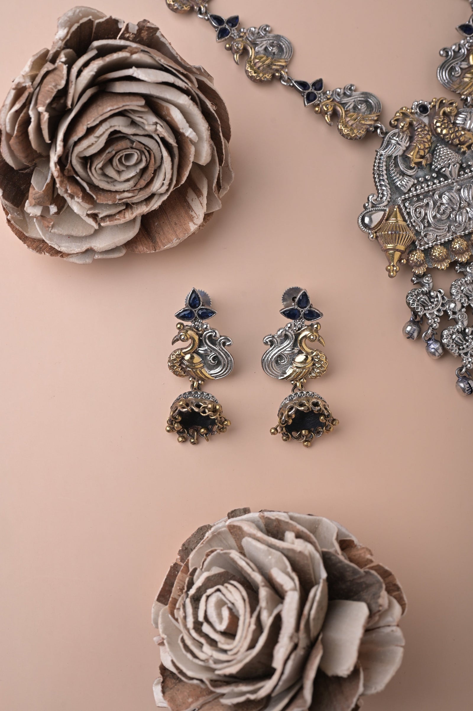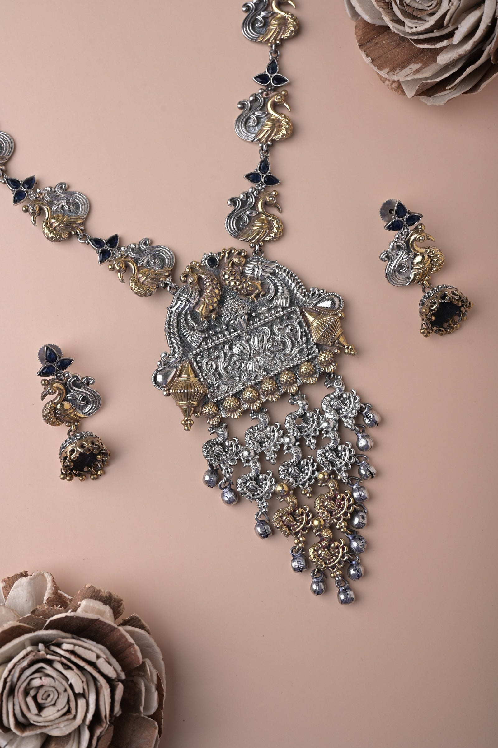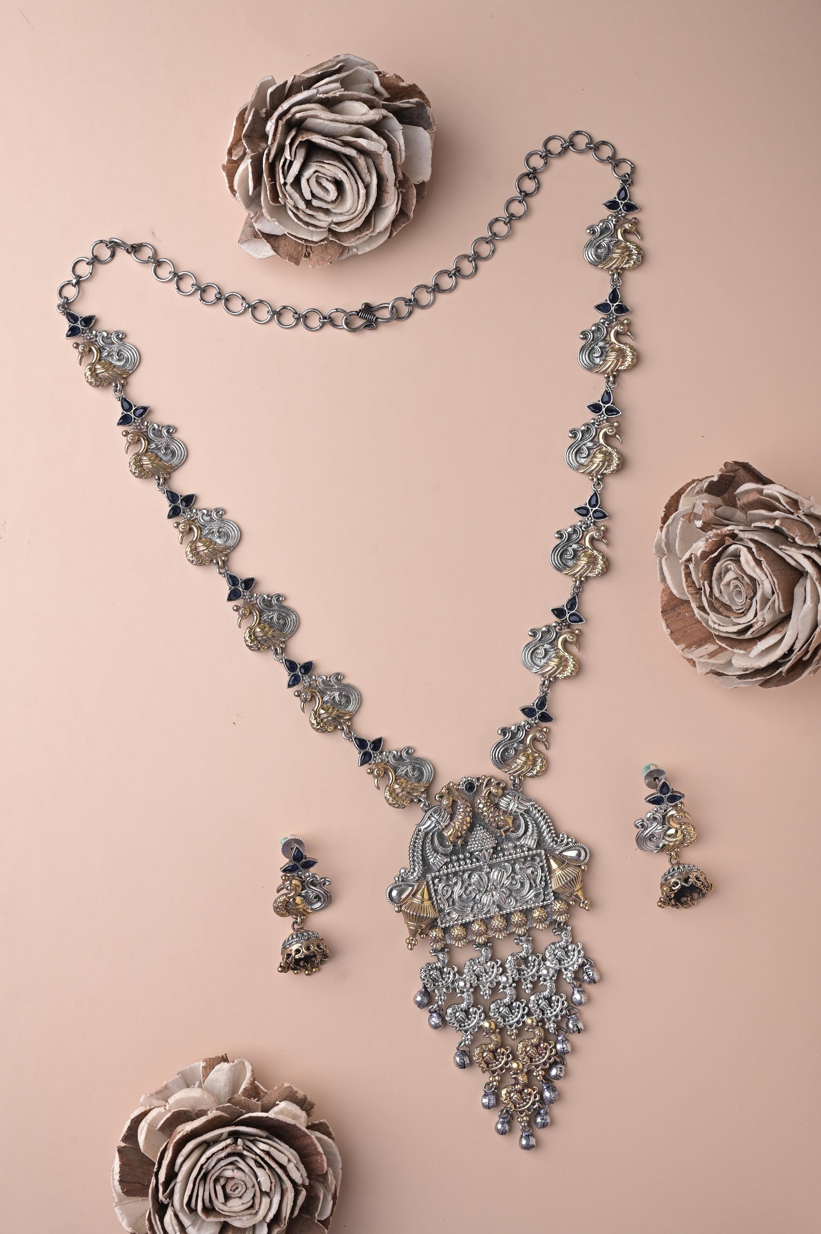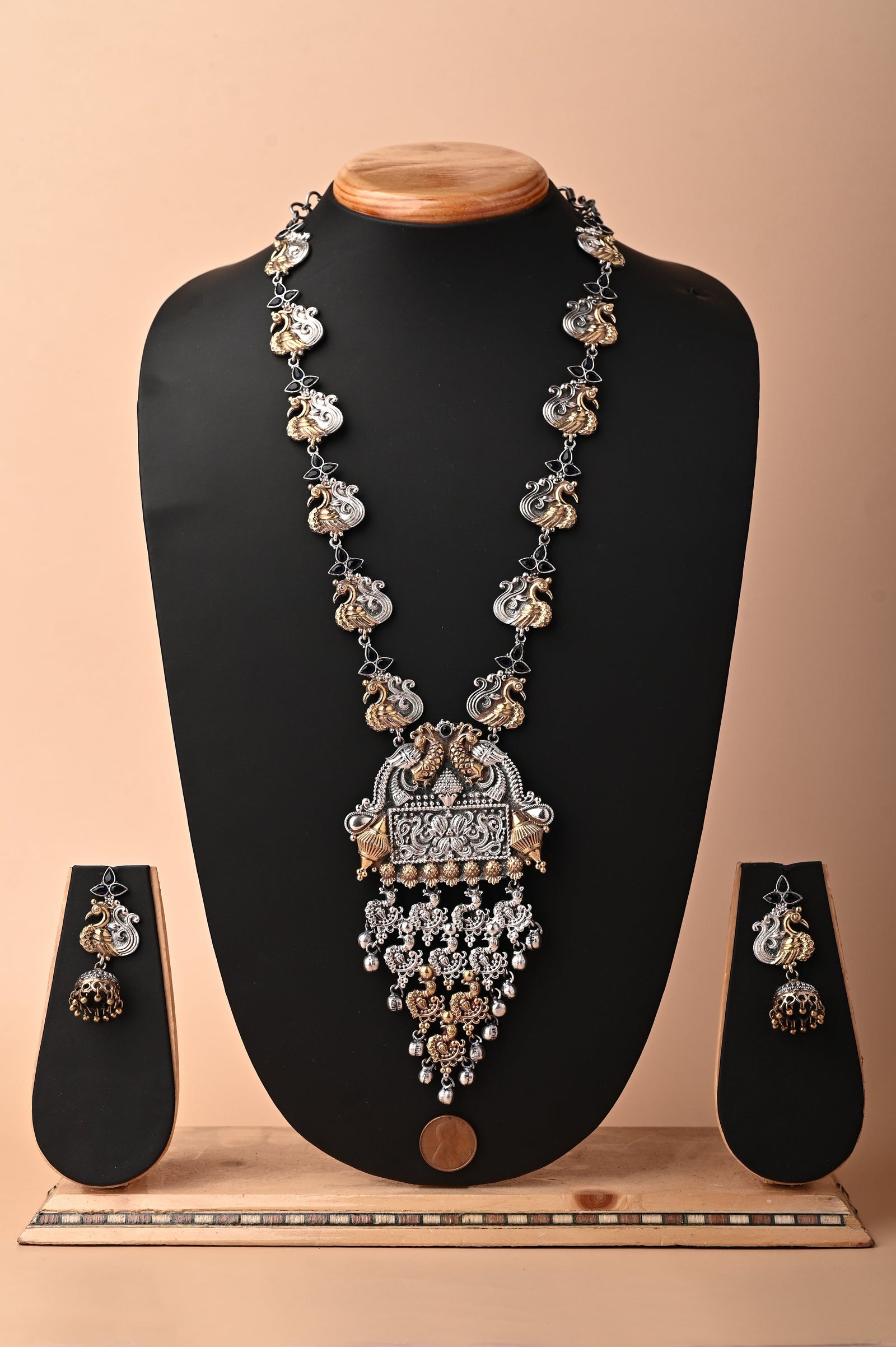 Get to know your accessory look this season with our silver and golden metal combination long sitahar style necklace set that comes with Monalisa stonework of dual tone finish, making this necklace set one of the eminent purchases and paired with beautiful silver mor (peacock) jhumkas beaded with stone. The penny is kept aside to make you understand the real size of the object.