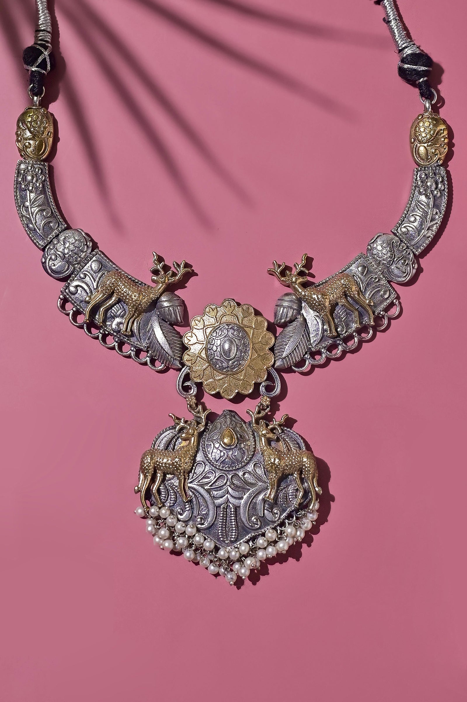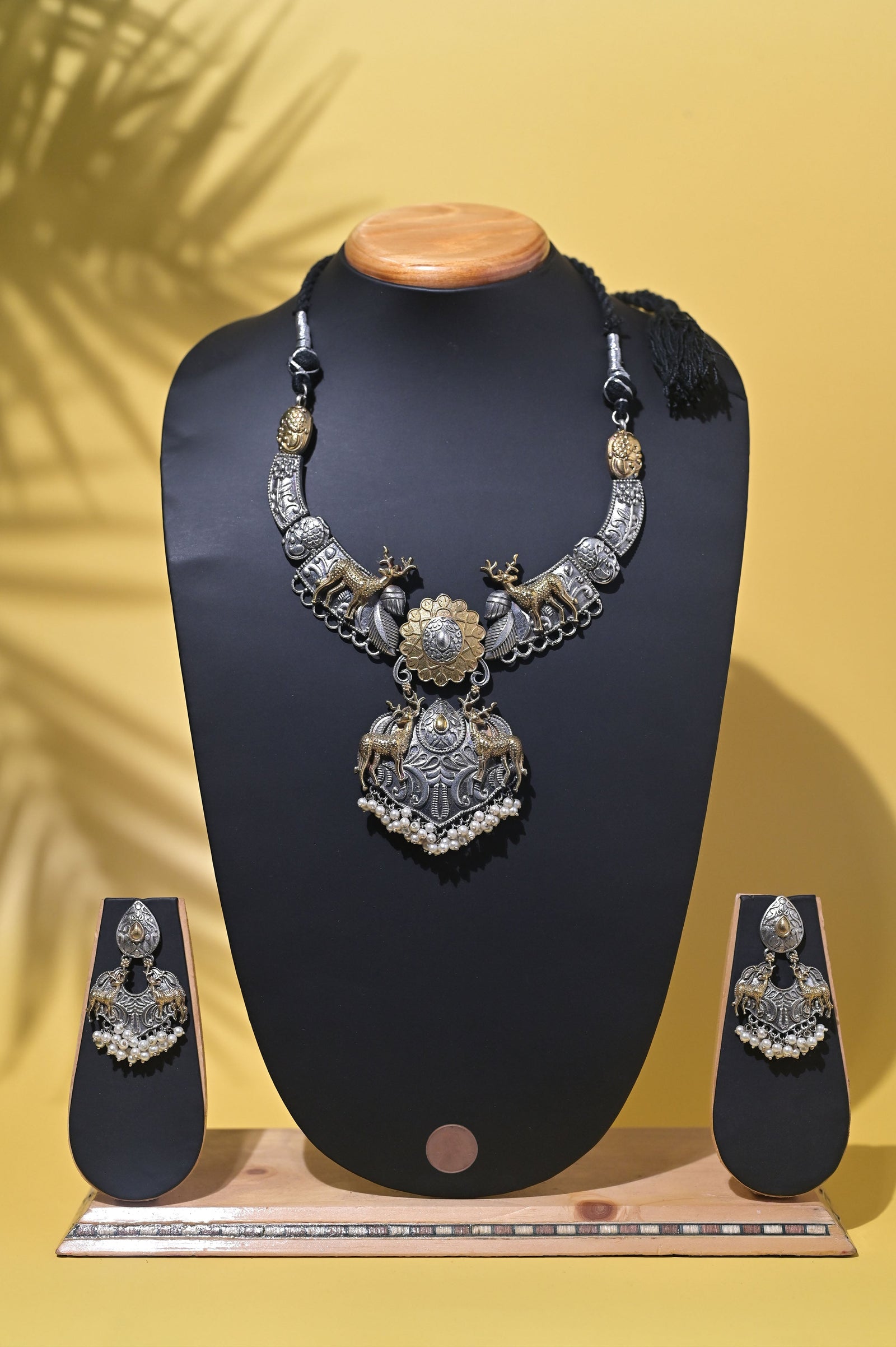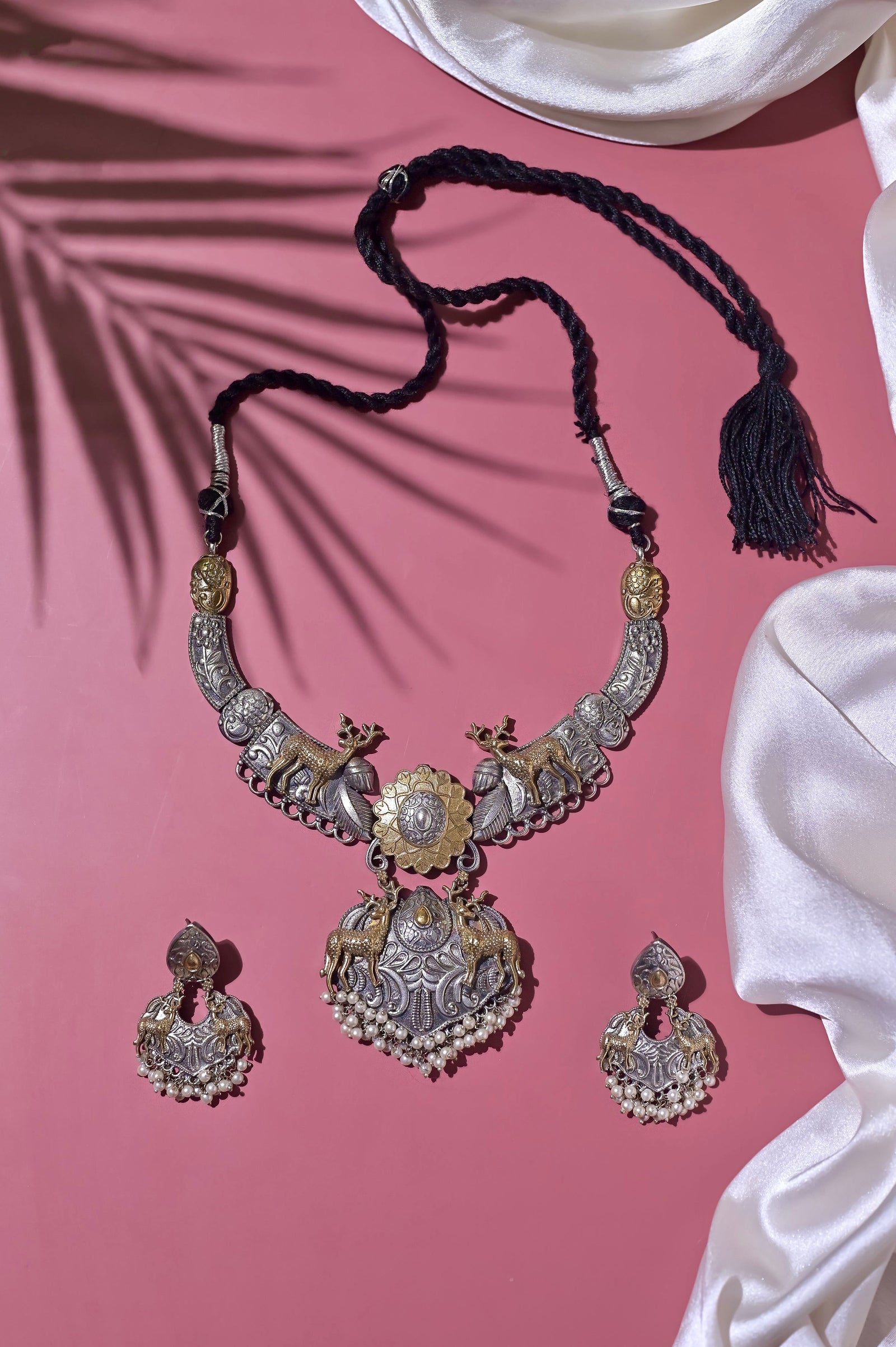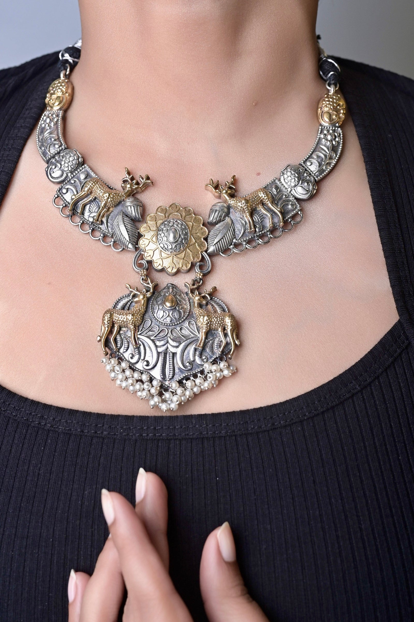 Bring the royal elegance of Rajasthan on your neck with this Marwar collection in silver and golden dual-tone metal collar necklace set with an animal (blackbuck) motif to make it more natural and connected to the earth. The matching earrings complete the aura of the set. The penny is kept aside to make you understand the real size of the object.