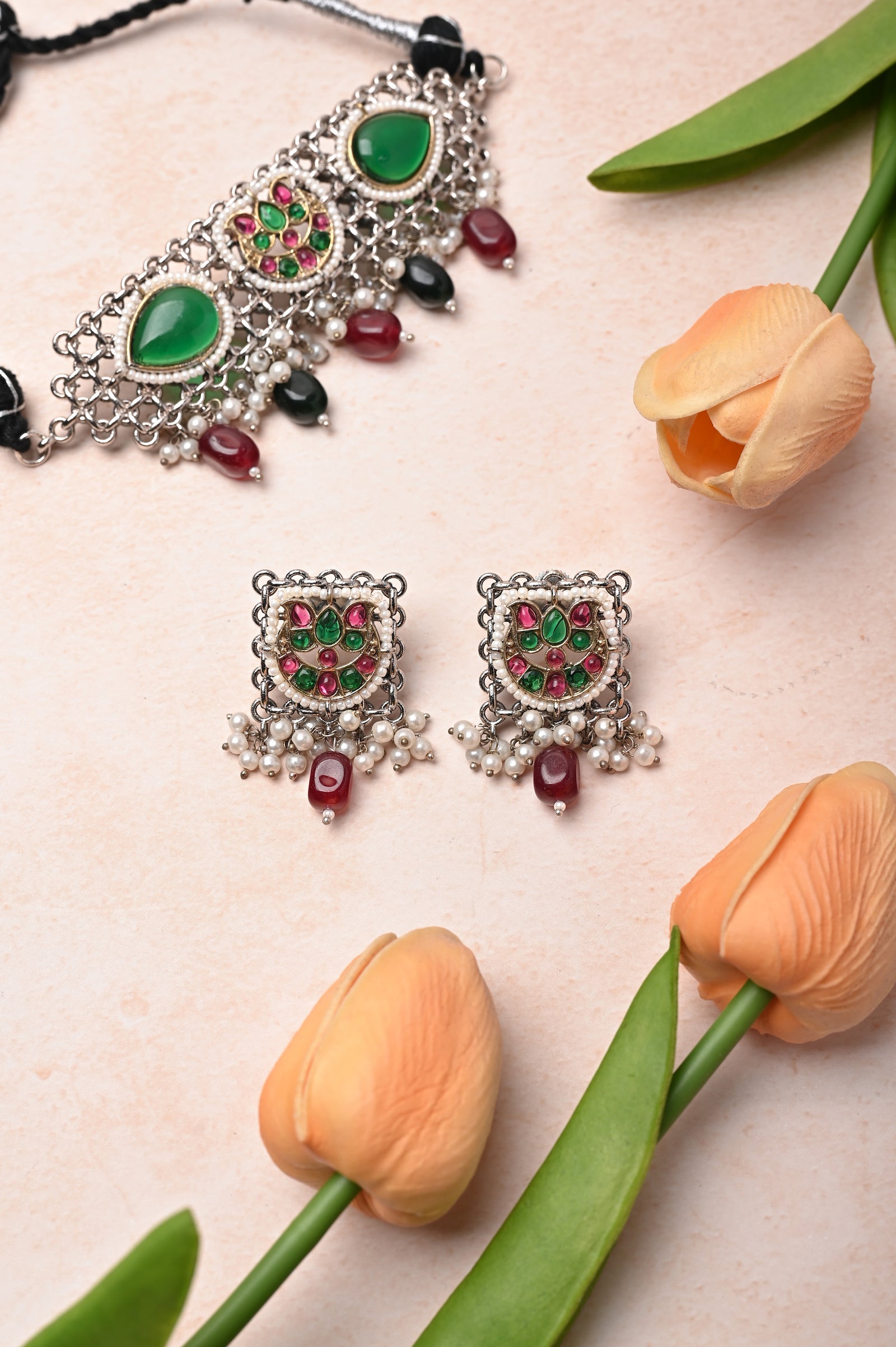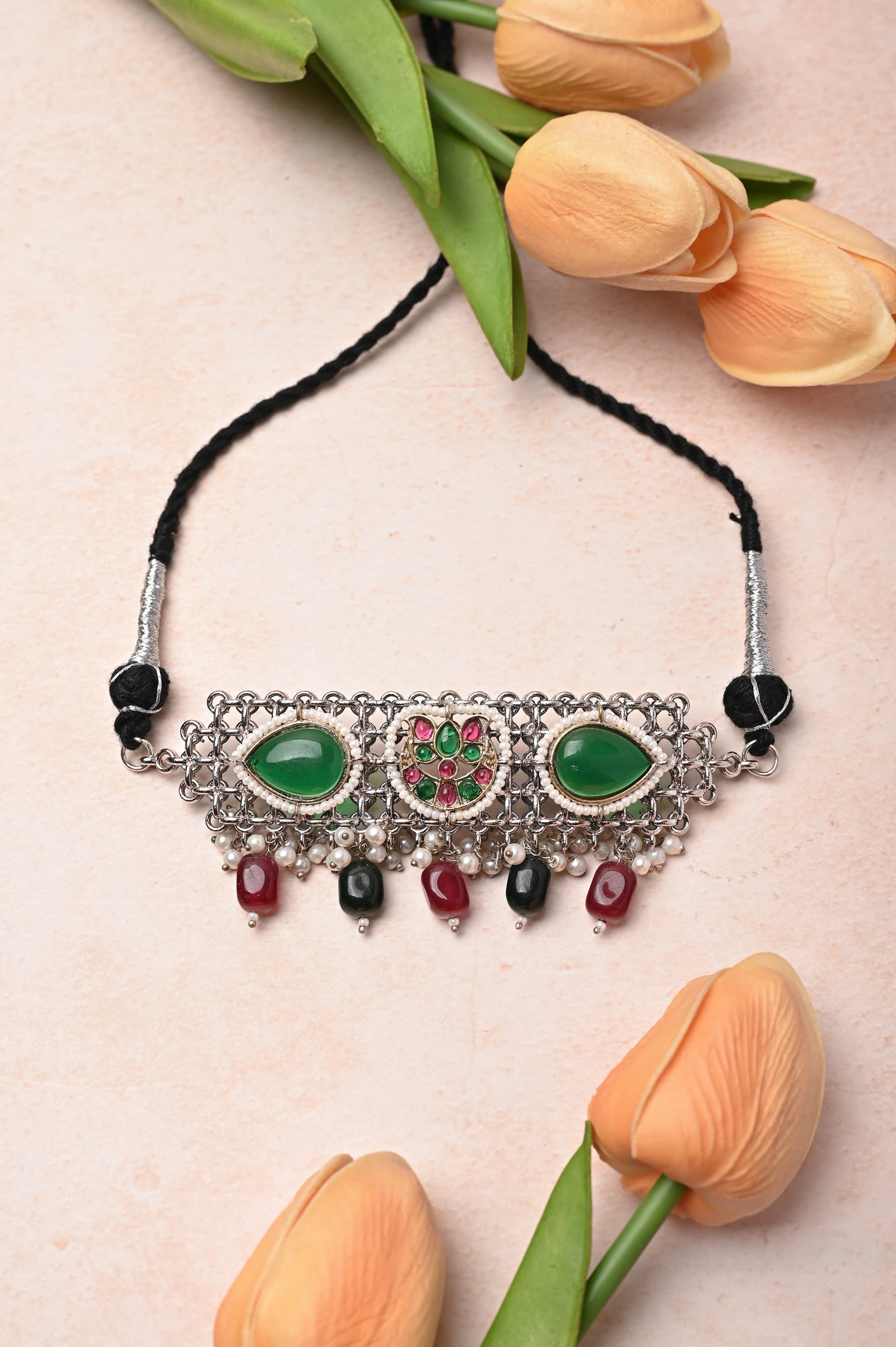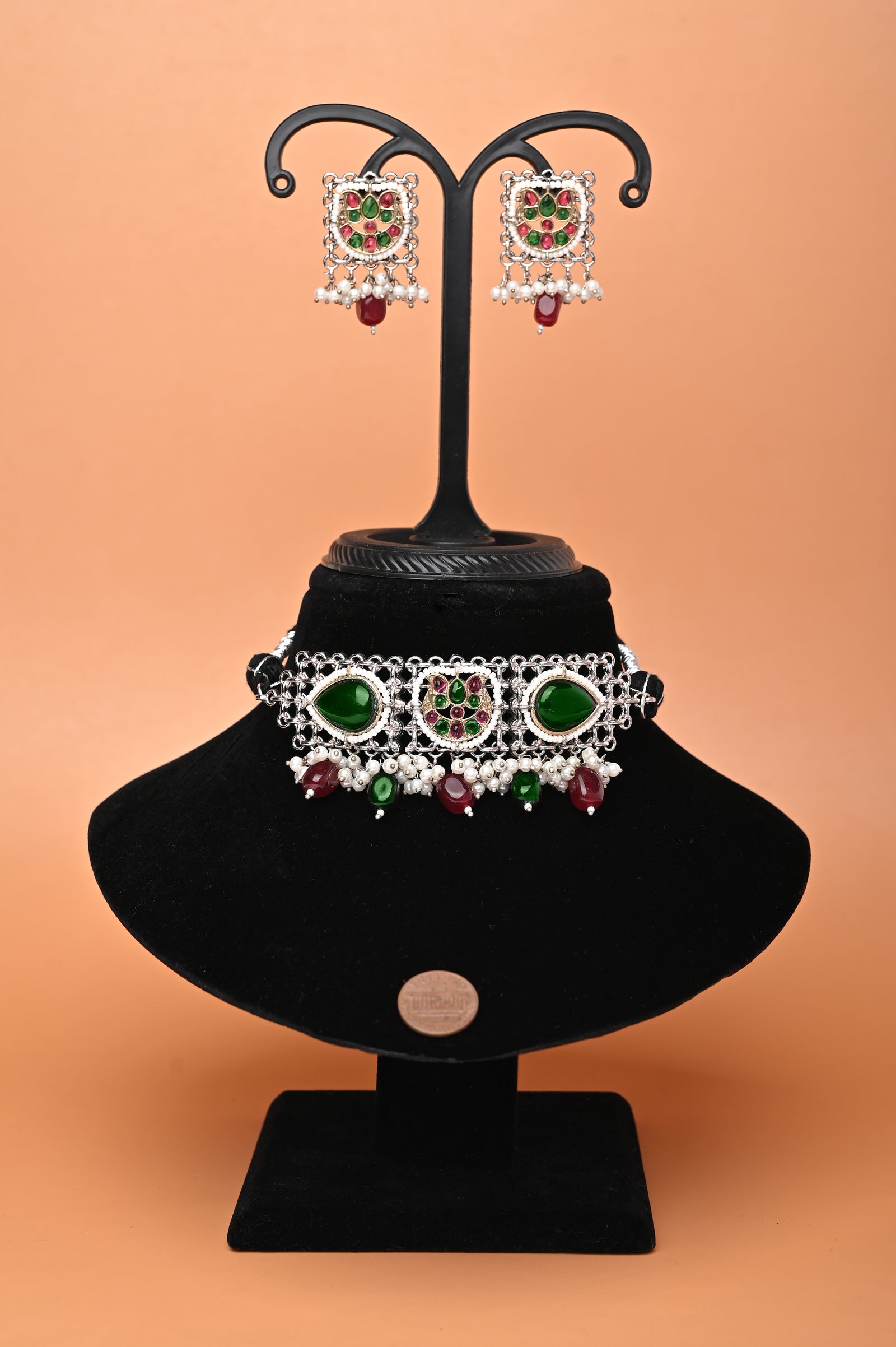 Transform your wardrobe with this meticulously crafted Kundan choker necklace set, complete with stunning monalisa stonework. The matching jharoka style jhumka earrings are adorned with vibrant tassels for added charm. The penny is kept by the side to help you understand the size of the product.