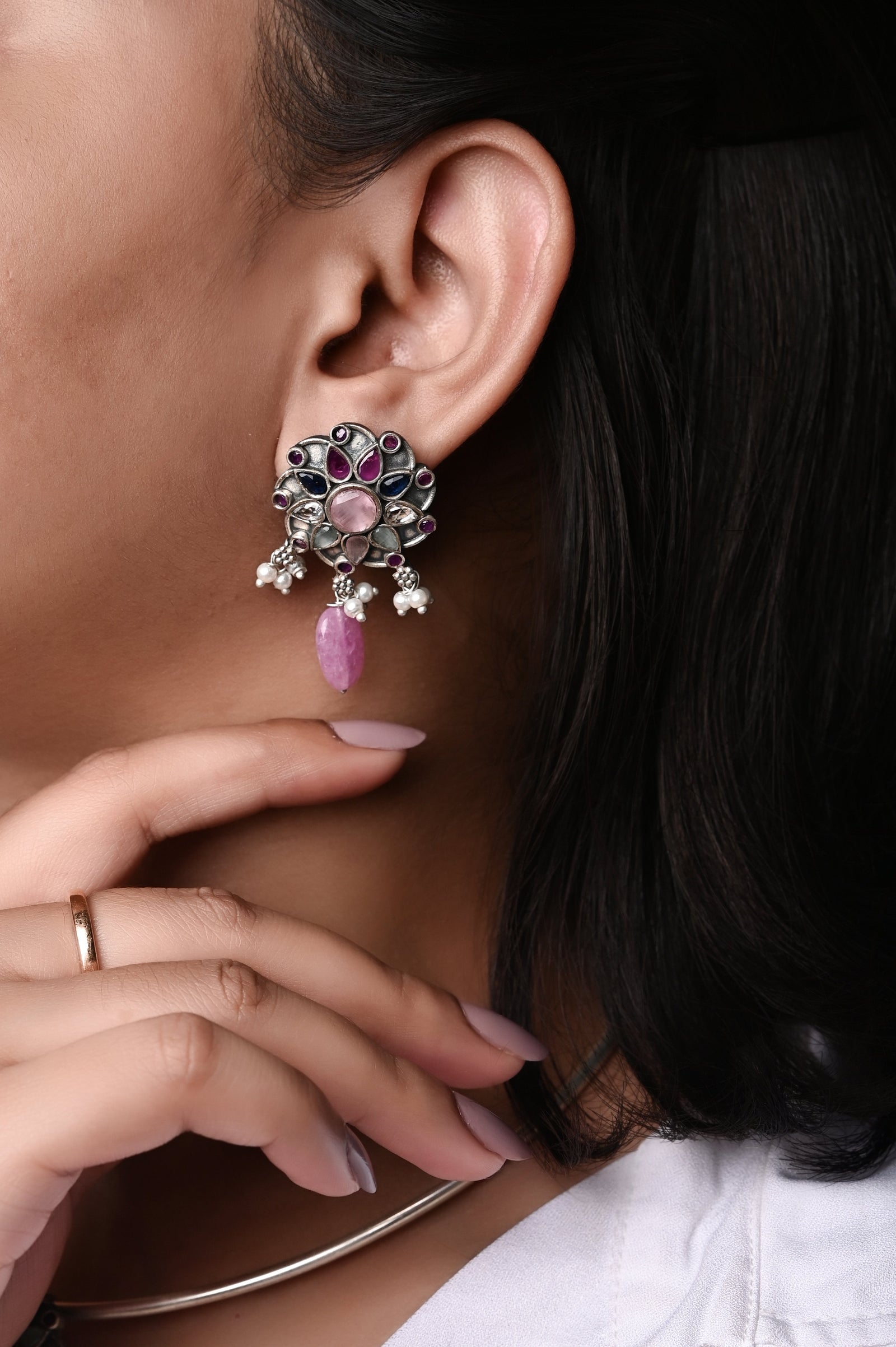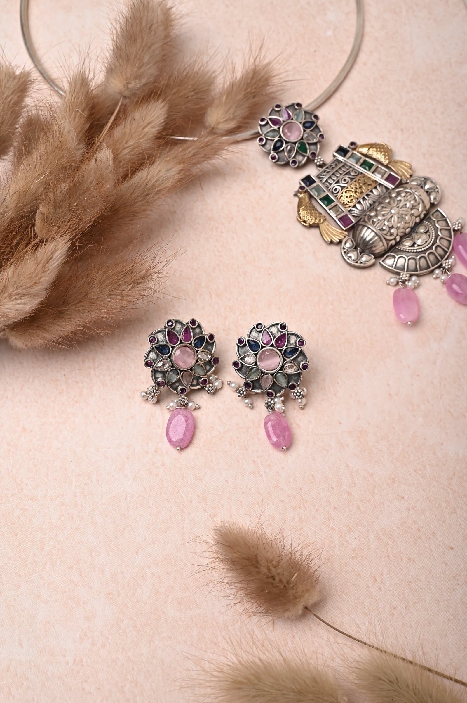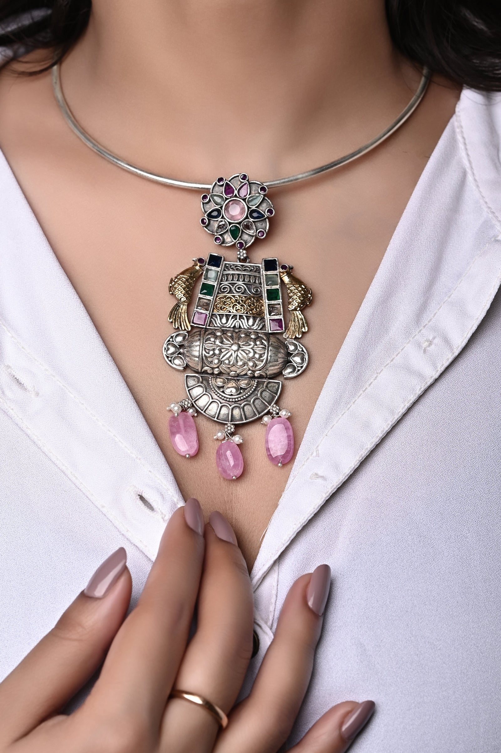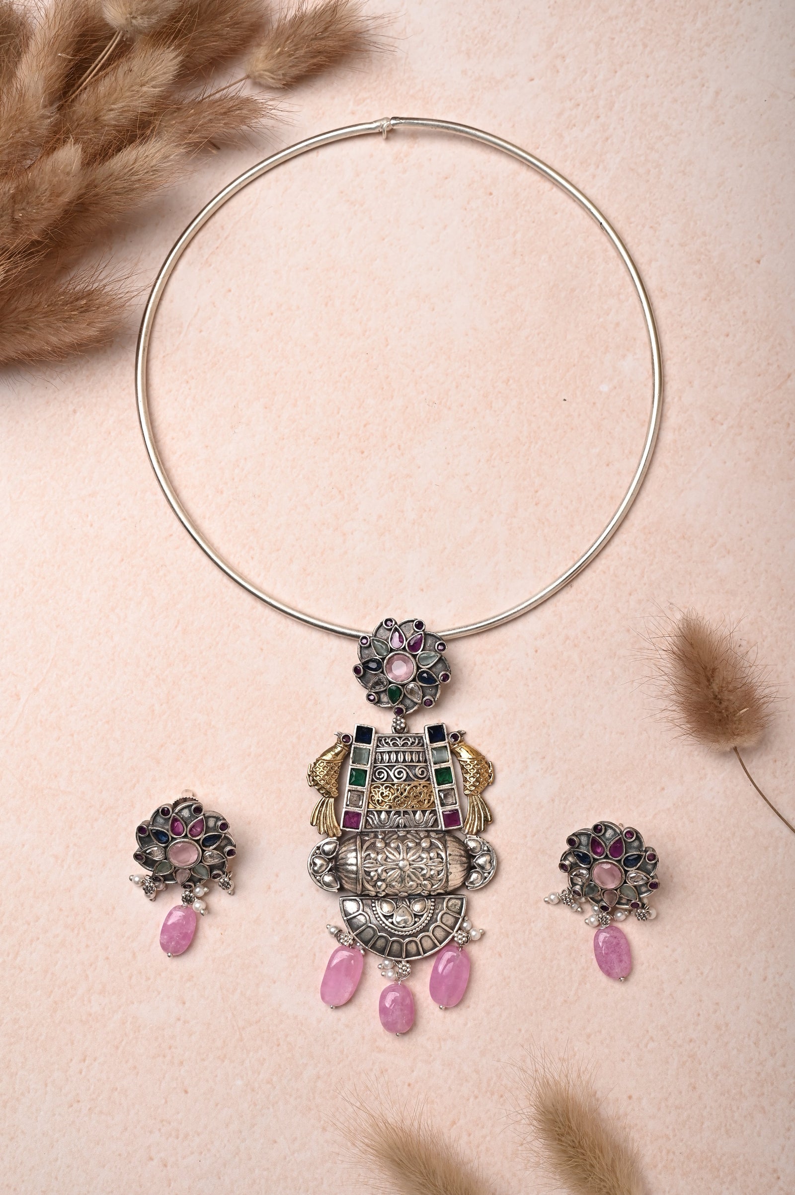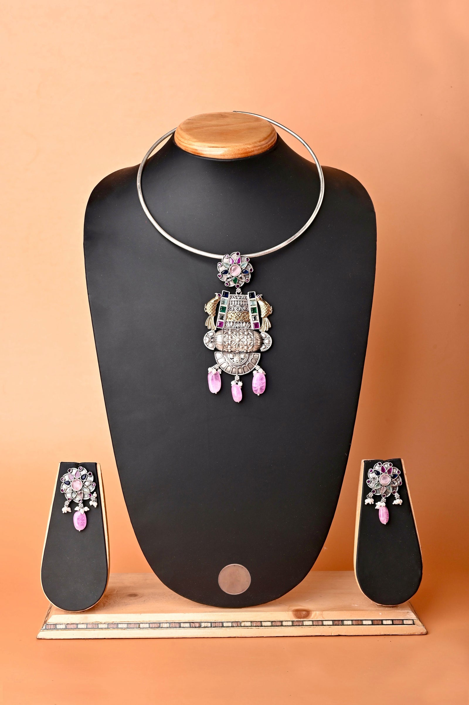 Kill the party onlookers with the new and perfect blends of rural and tribal art with a modern-day jewelry design. We bring you a collar-style large pendant hansuli necklace set. It comes with a big pendant in a dual-tone color made out of Monalisa stone bejeweled lapis lazuli of multiple colors. It comes with statement jhumkas made which dazzles brighter than you thought. The penny kept beside helps to understand the real size of the ornament.