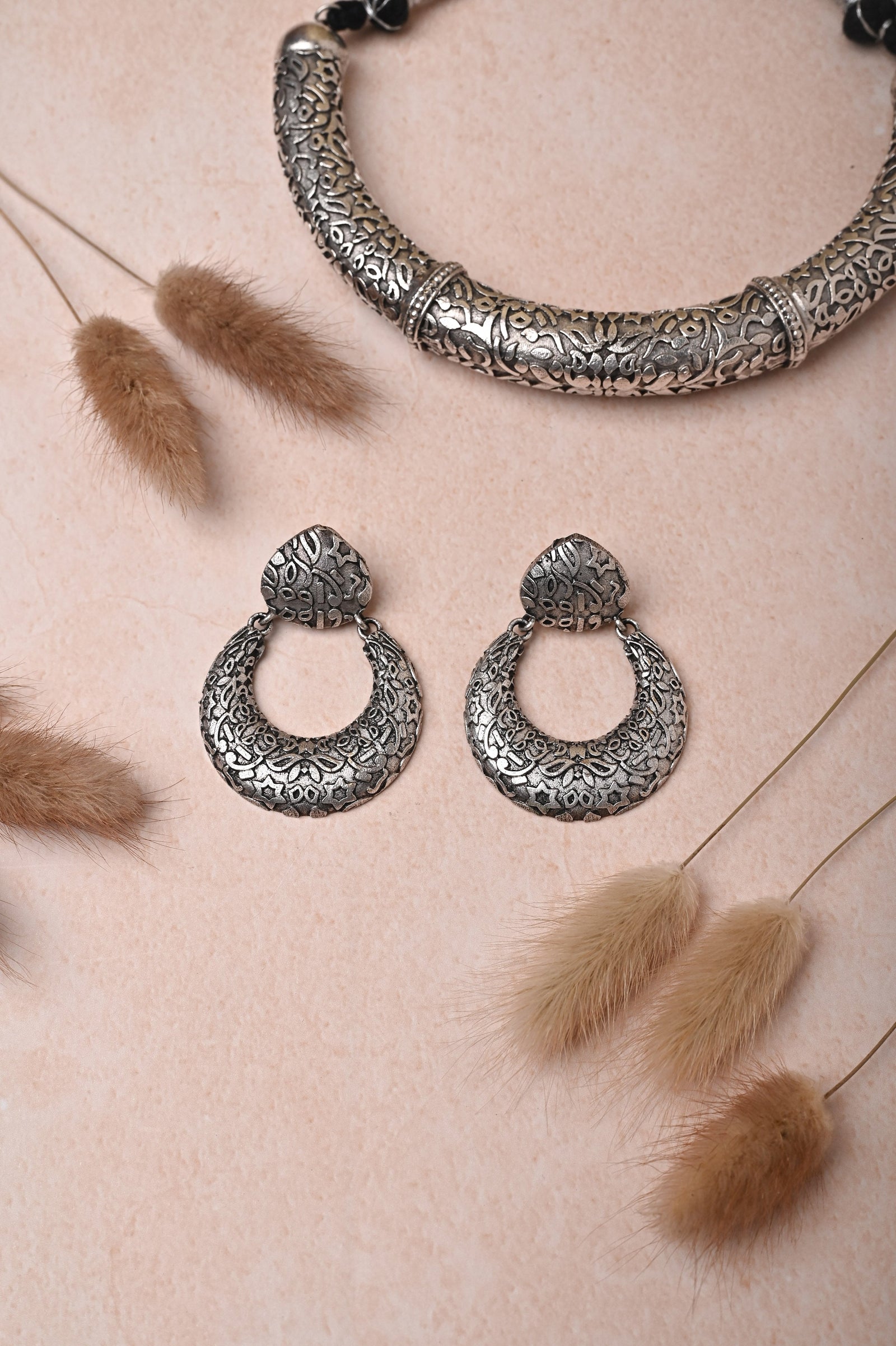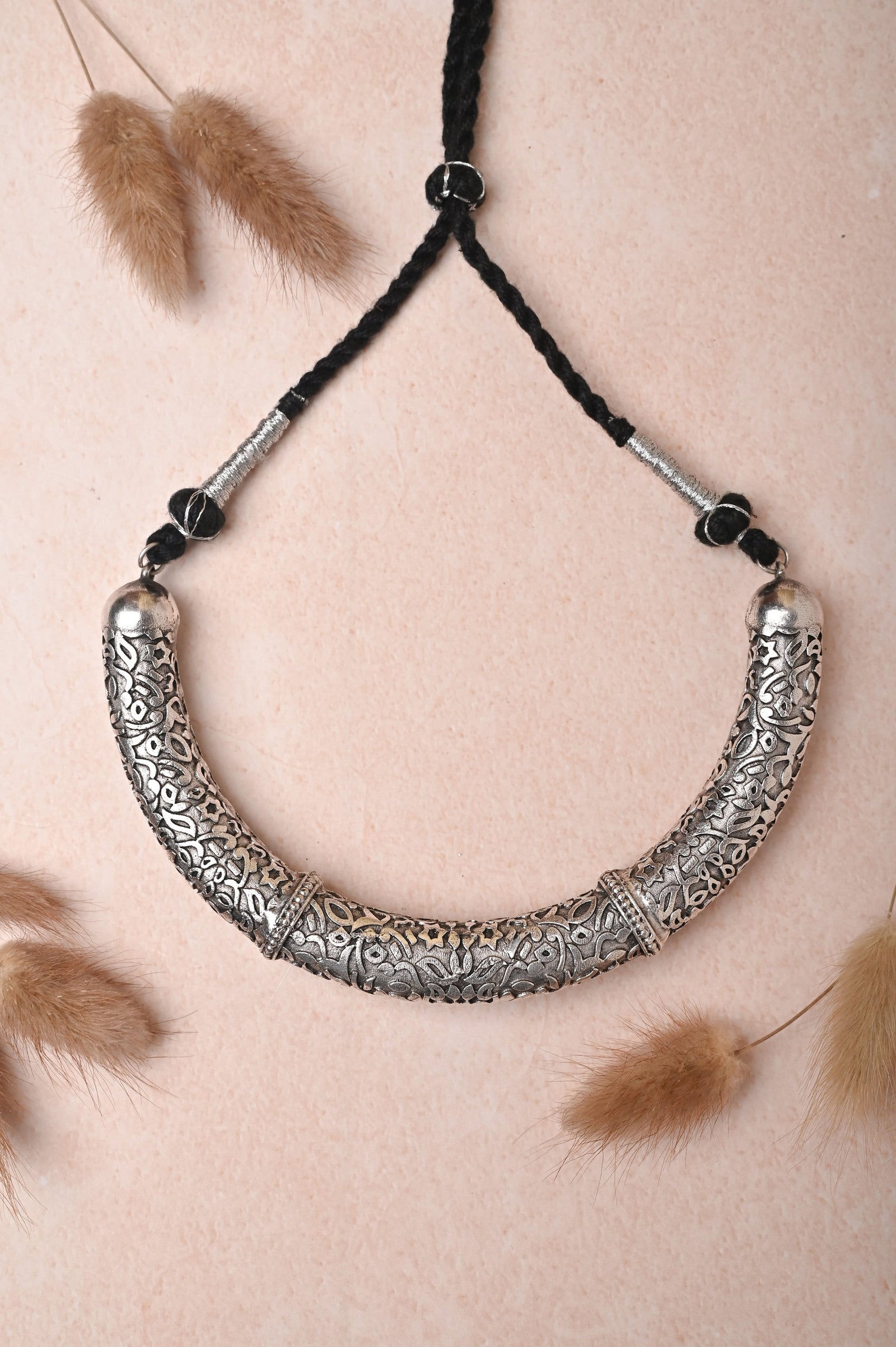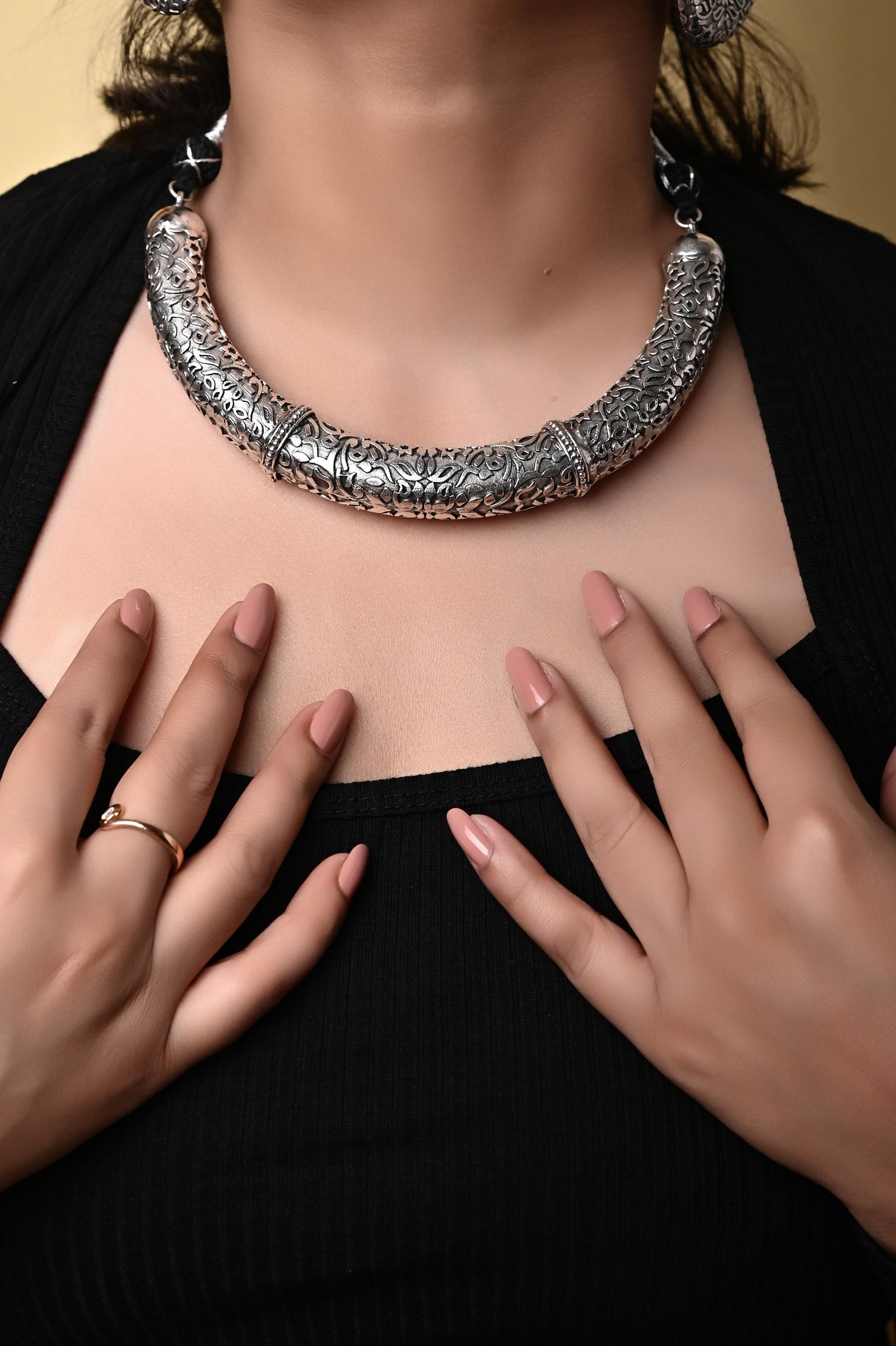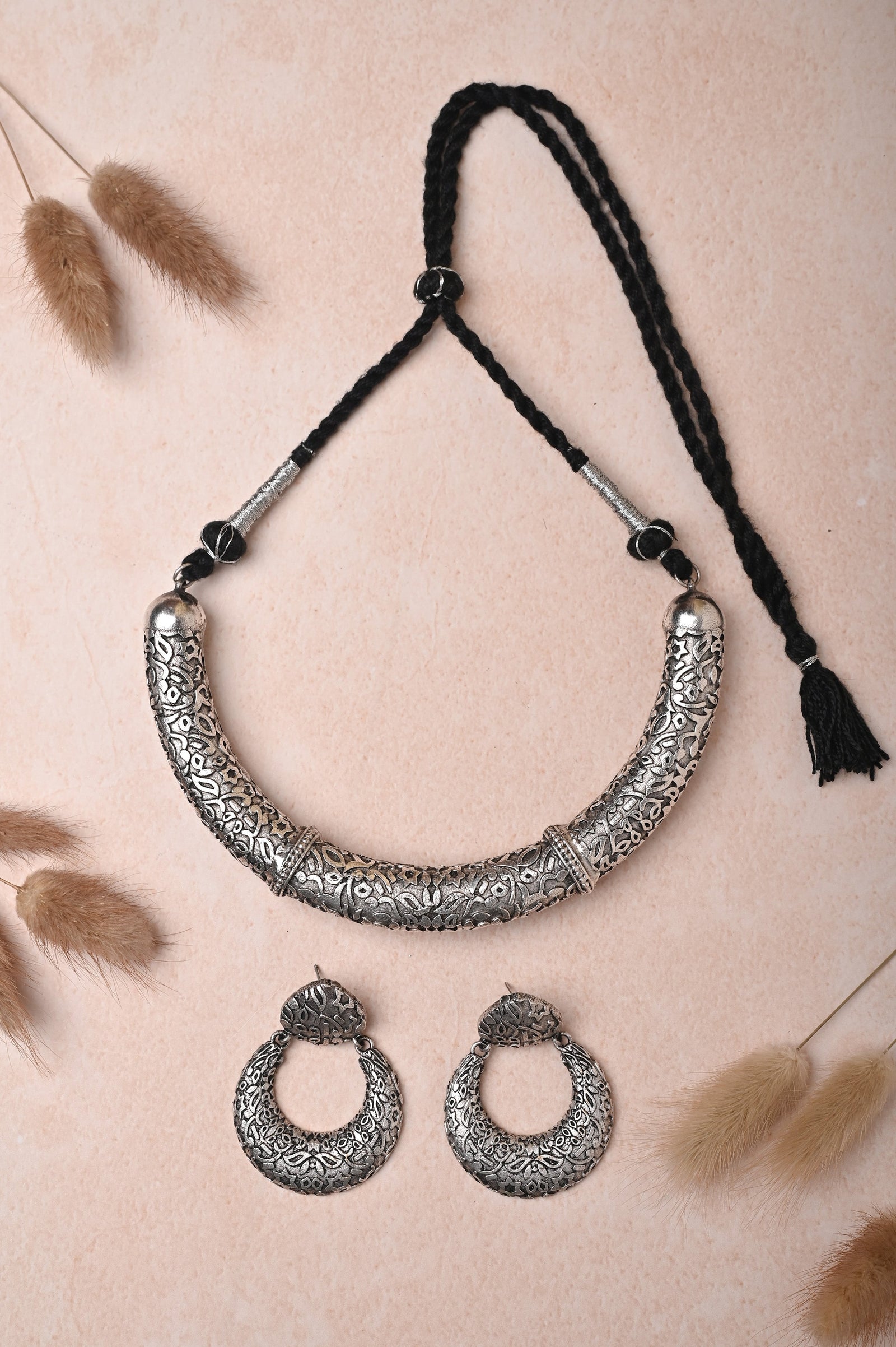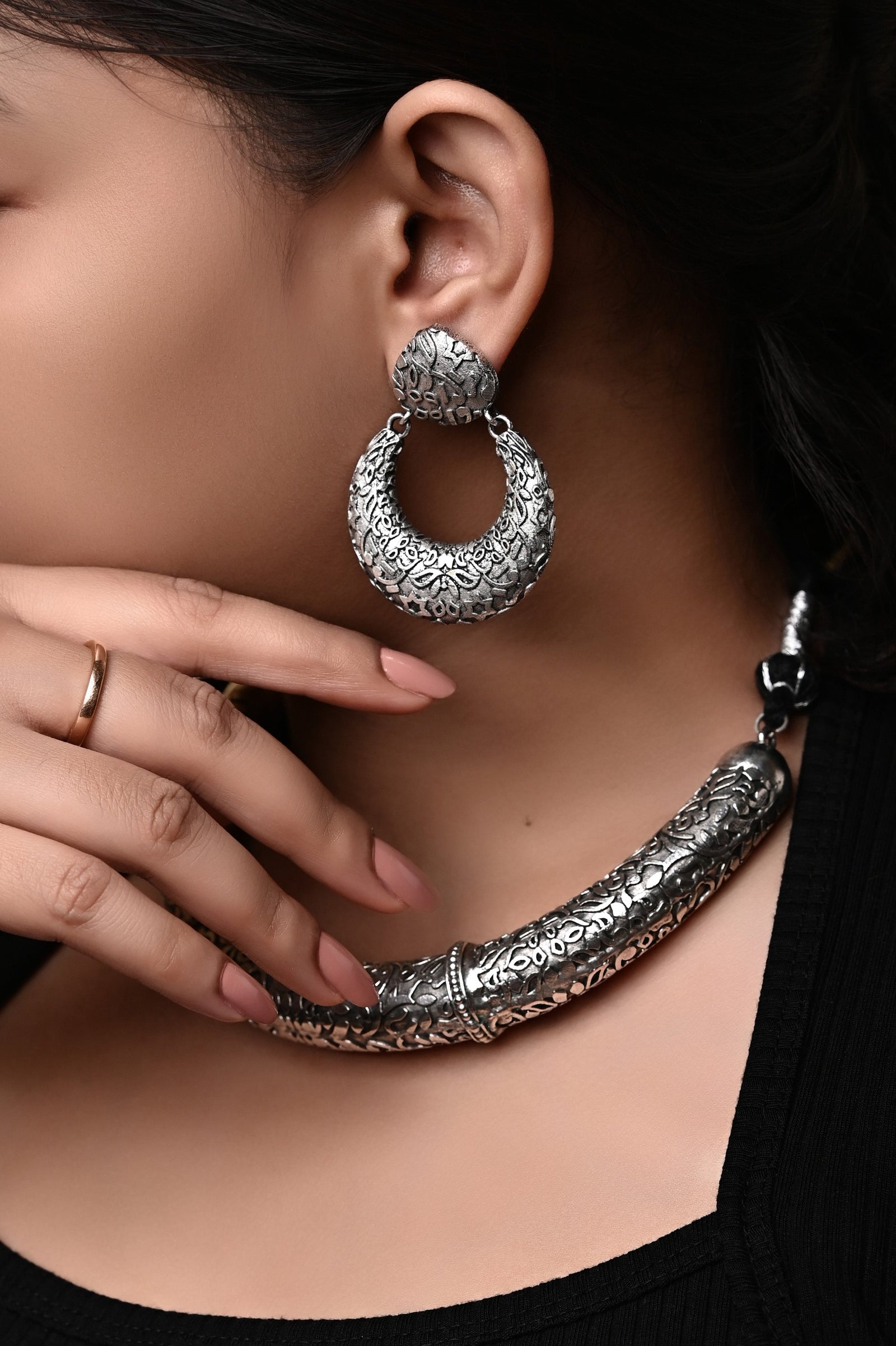 Unleash your inner boho queen with this stunning Silver Metal Hansuli Necklace Set! Paired with matching tribal Chandbali earrings, this duo is a bold, playful nod to tribal elegance. Whether you're dancing at a festival or brunching with friends, this set brings the perfect bohemian vibe!The penny is kept aside to make you understand the real size of the object.