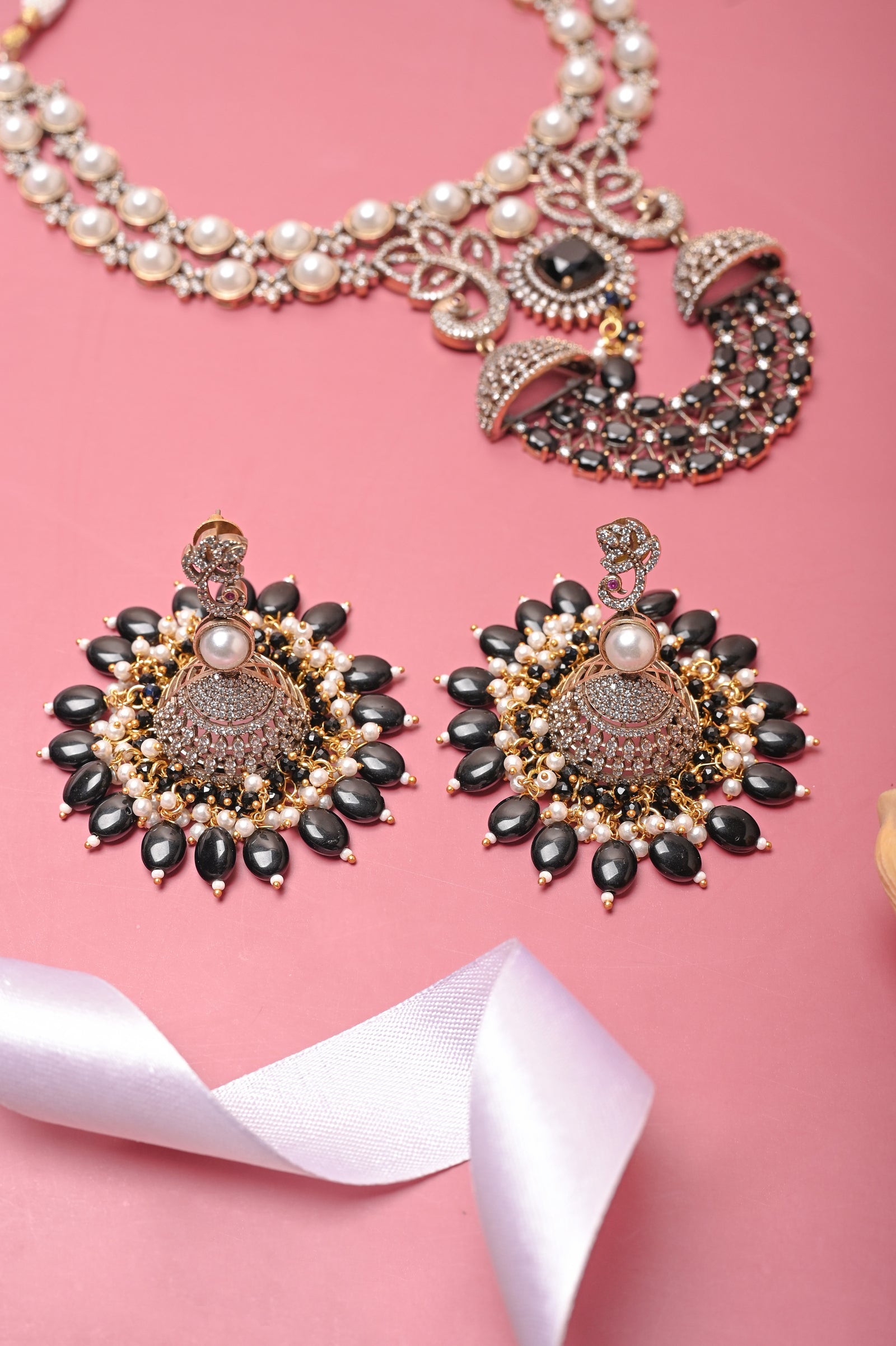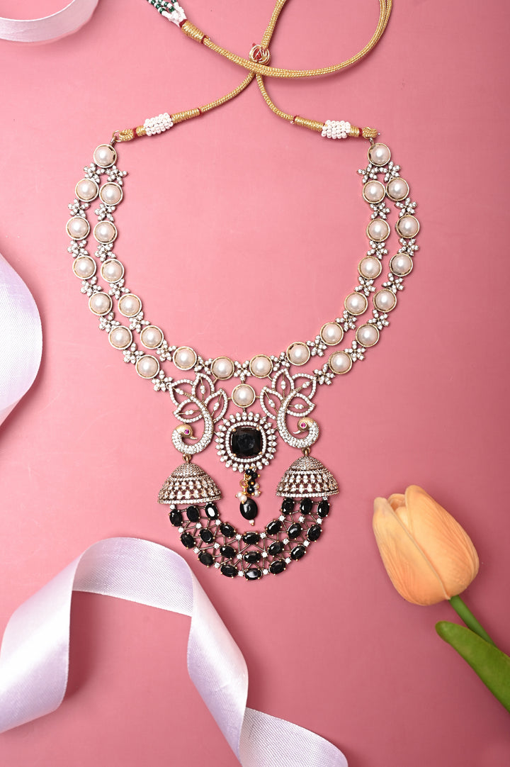 Upgrade your jewelry collection with our silver-toned stonework and pearl-work princess-style necklace set. The intricate stone work and elegant pearl string make for a stunning combination. Complete your look with the matching fusion mandala style jhumkas. Perfect for any occasion! The penny is kept by the side to help you understand the size of the product.