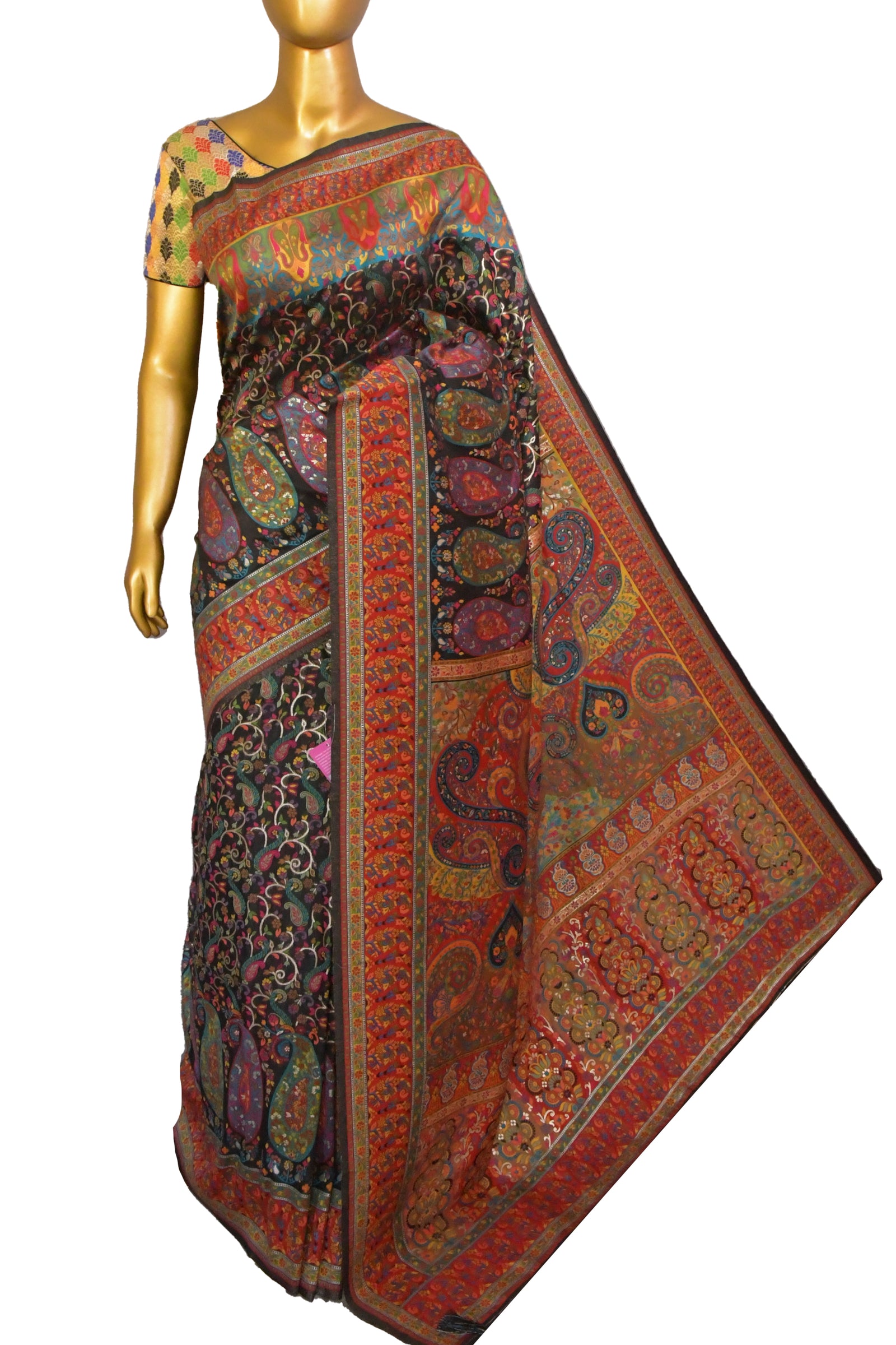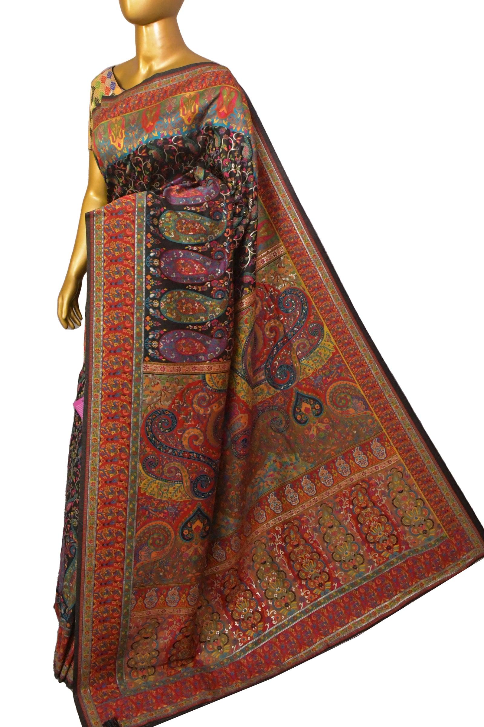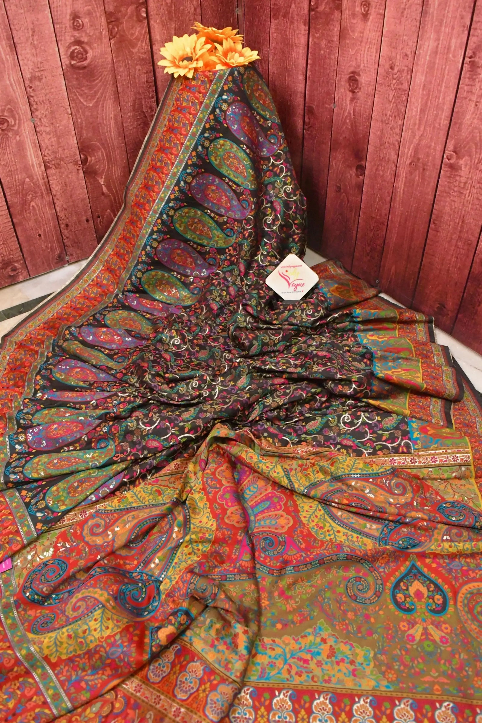 Discover the epitome of elegance with our opulent slate black Kani silk saree. The black hue beautifully complements the mesmerizing multicolored jaal weaving, elevated to new heights with detailed pashmina accents. This saree will elevate your wardrobe and bring an air of luxury and sophistication to any occasion!