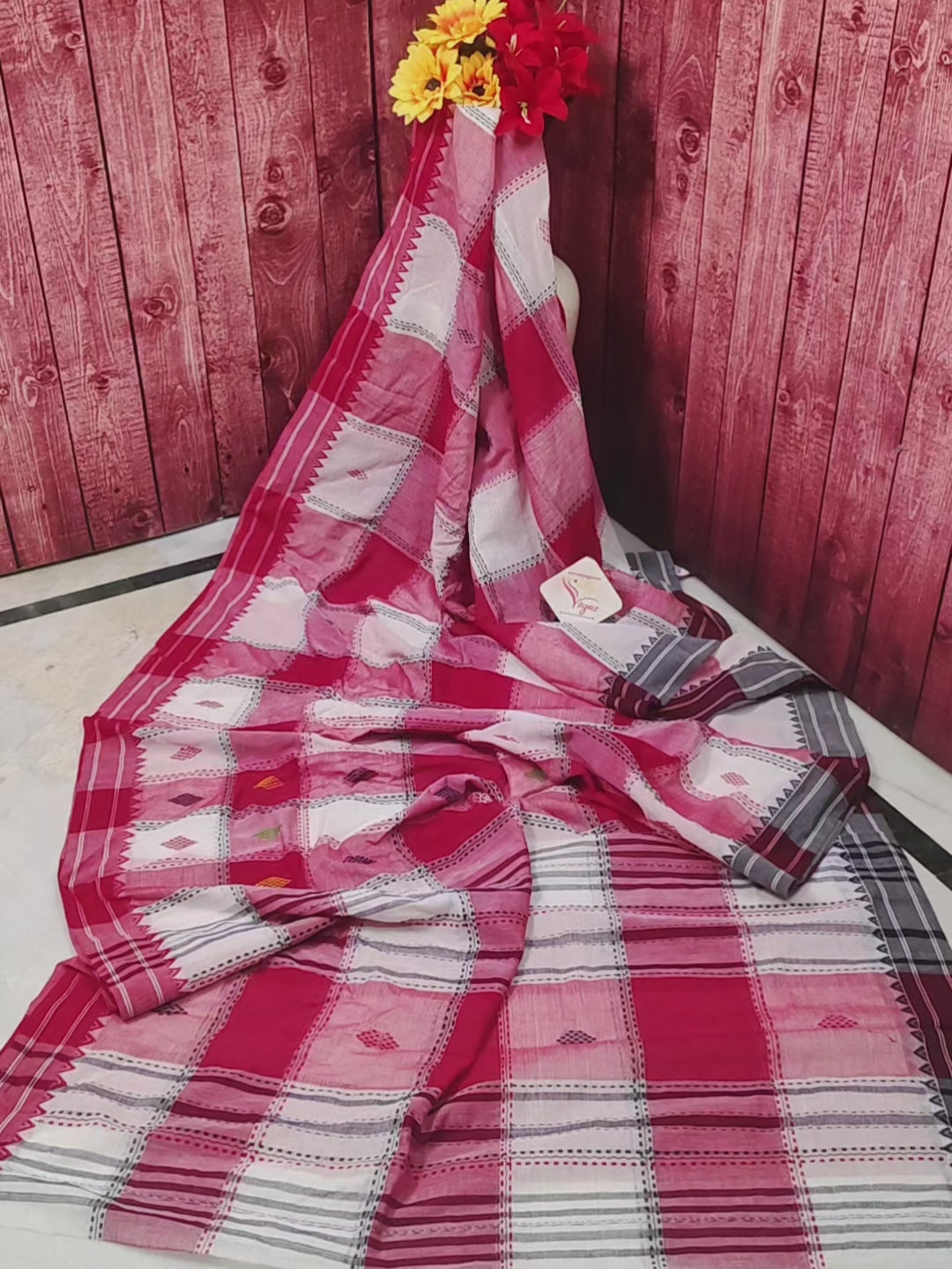 Woven entirely by hand, this beauty features all-over checks that add a timeless appeal, while the striking Ganga Jamuna border in vibrant red and deep black frames the drape with traditional elegance. The soft khadi cotton ensures it’s light, breathable, and oh-so-comfortable — perfect for sunny days, casual gatherings, or cultural celebrations.