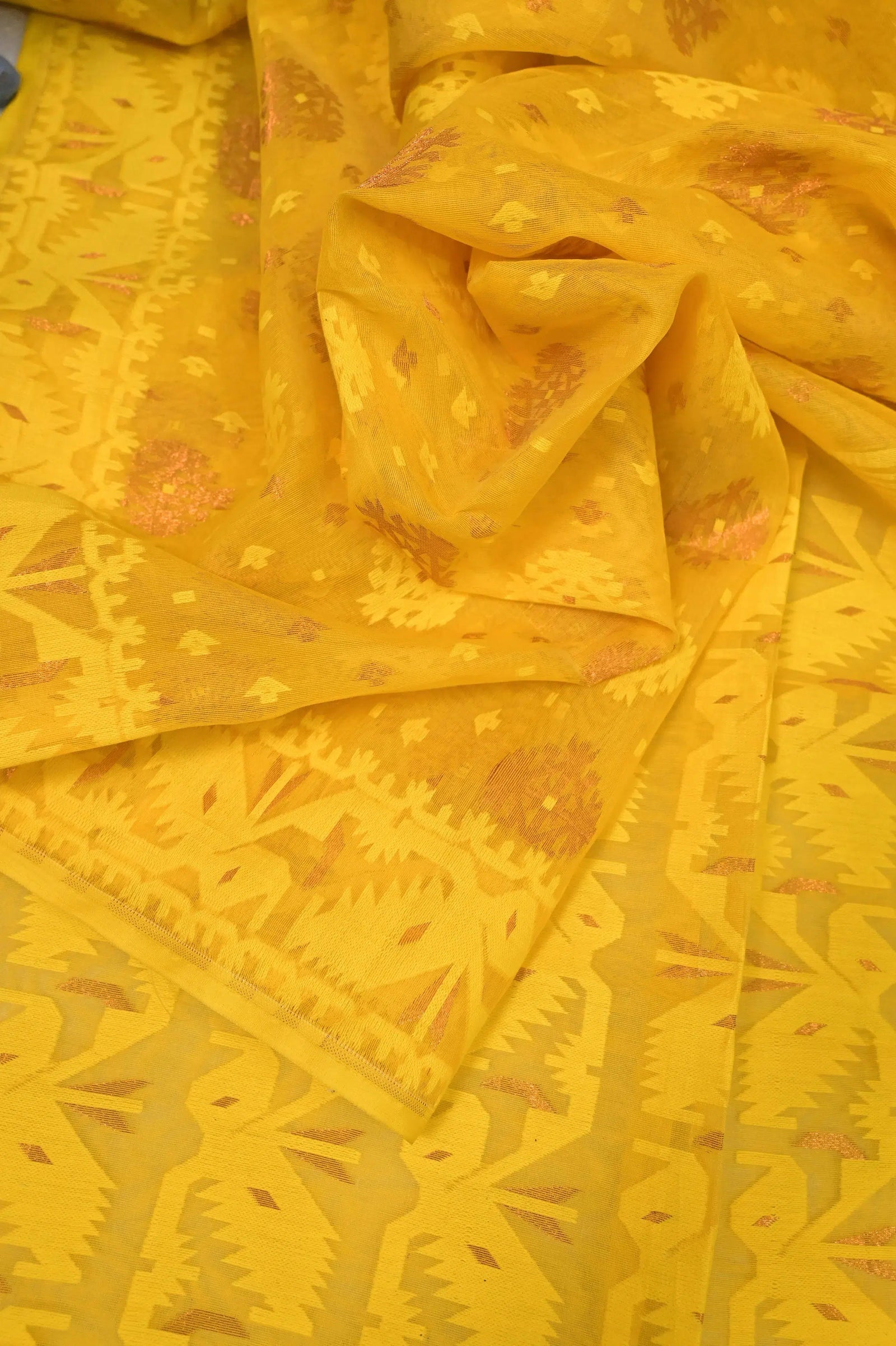 Sunflower Yellow Color Jamdani Saree with Self Weaving and Copper Zari Buti Work
