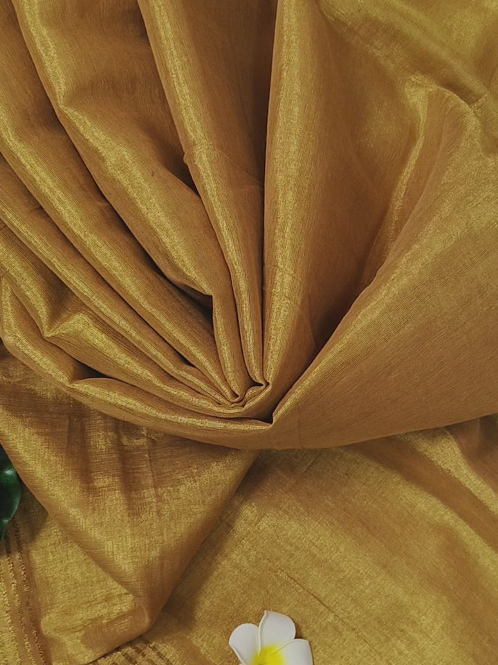 Tissue Linen Saree in Christmas Golden Color with Zari Stripe Work on Pallu