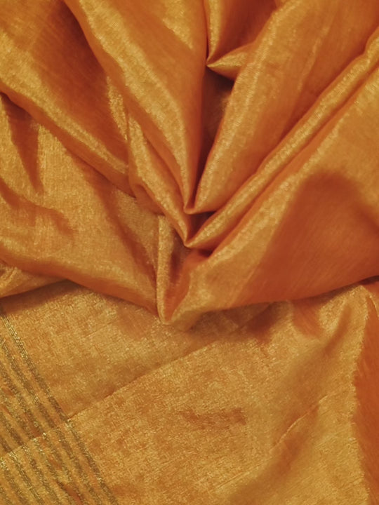 Tissue Linen Saree in Metallic Orange Color with Zari Stripe Work on Pallu