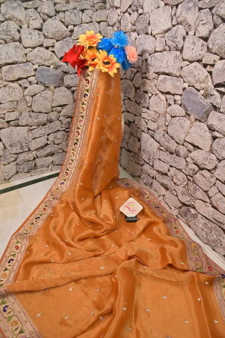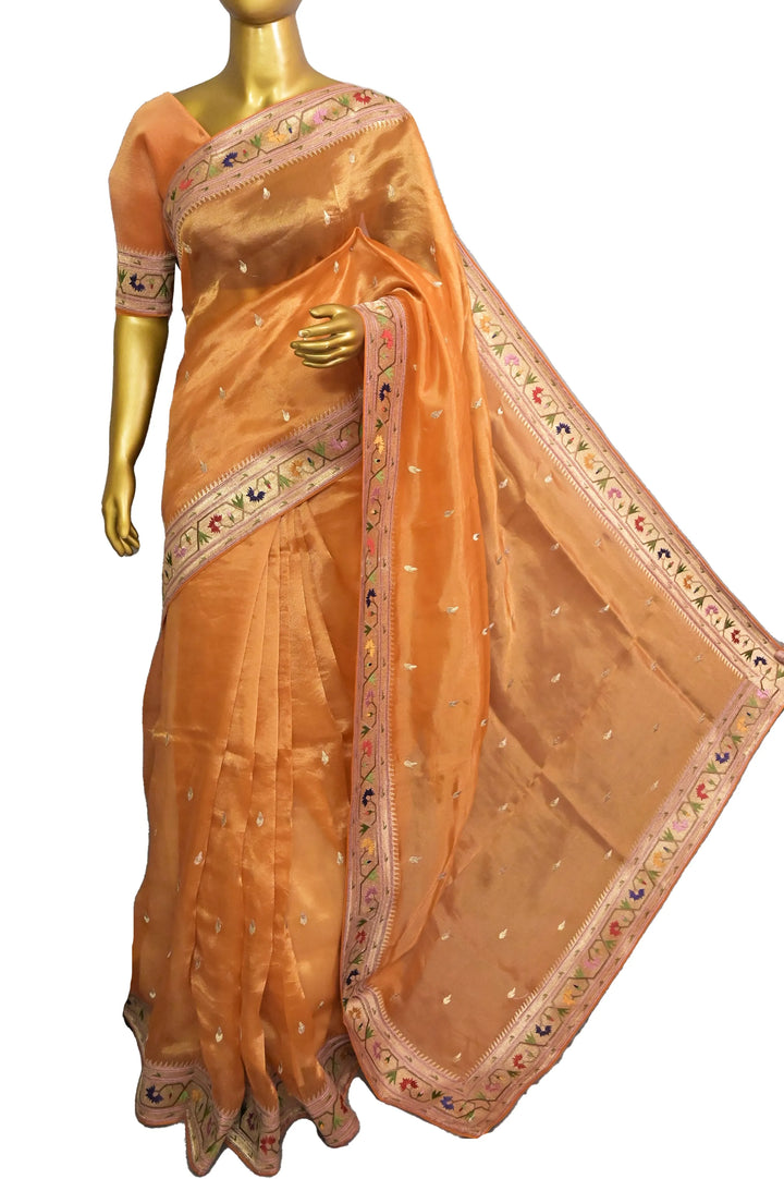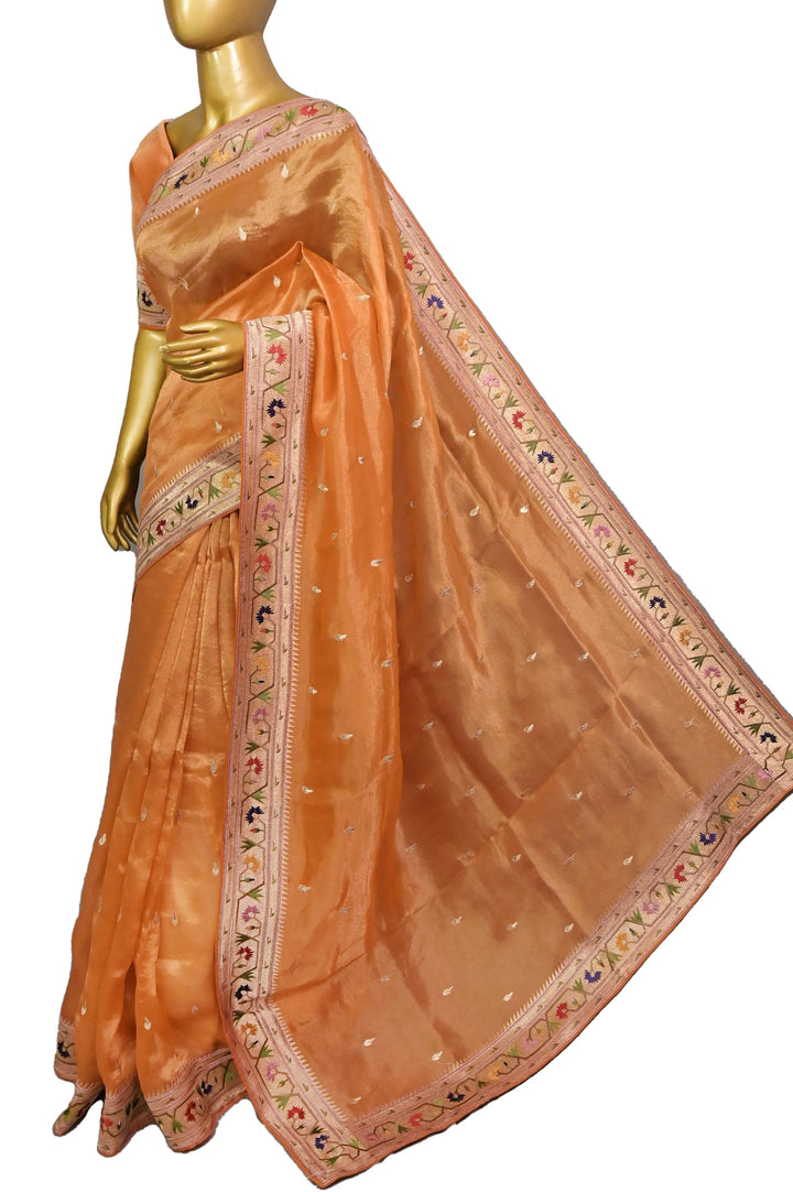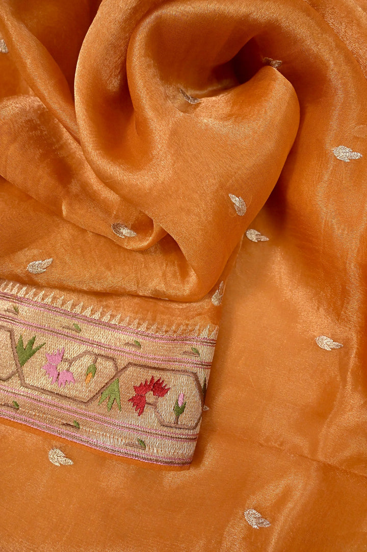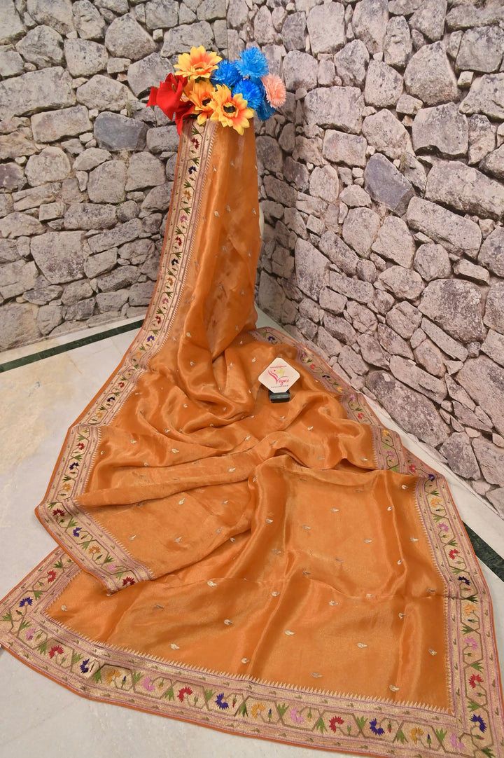 Tissue Saree in Orange Color with Paithani Style Embroidery Border with Zari Buti