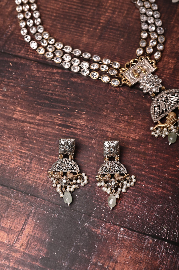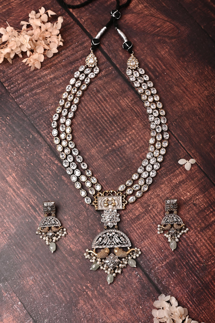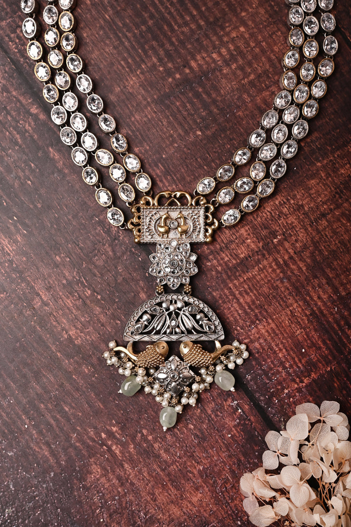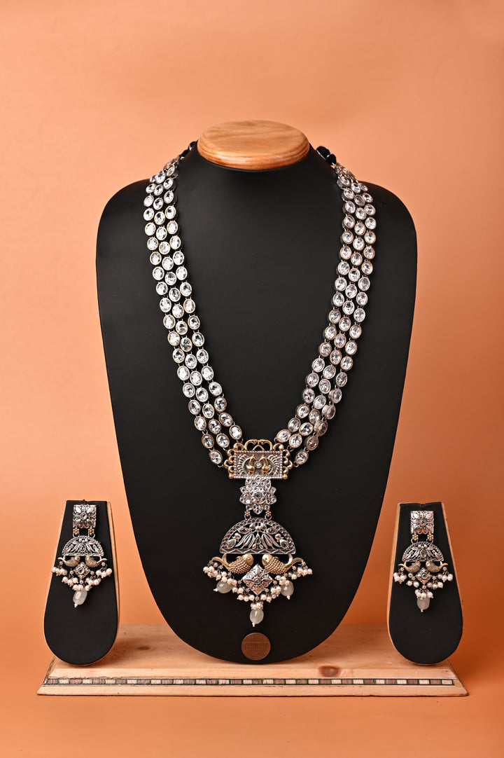 Get ready for the latest, greatest collection that will leave your admirers breathless. This Sitahar style long golden & silver dual tone necklace set features a lovely kundan work on the triple-layered neckpiece and coordinating earrings. The penny is kept aside to make you understand the actual size of the necklace.