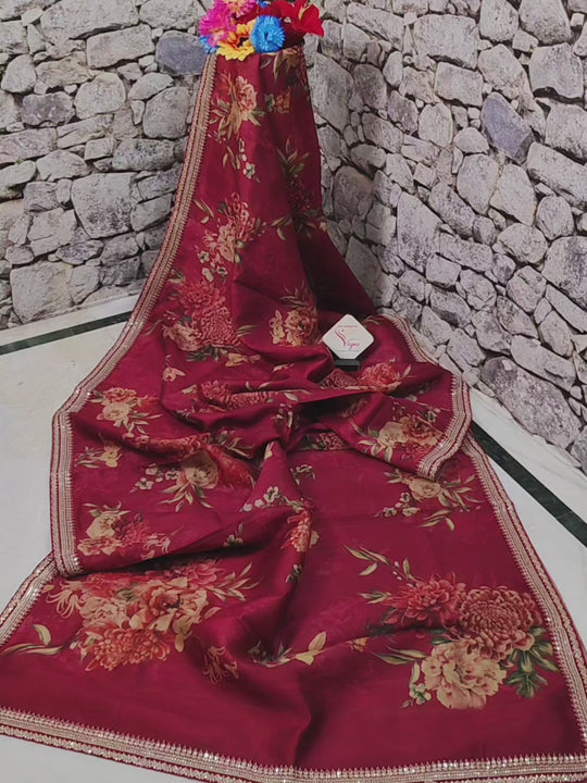 Tussar Silk in Maroon Color with Digital Print Work and Sequin Embroidered Border
