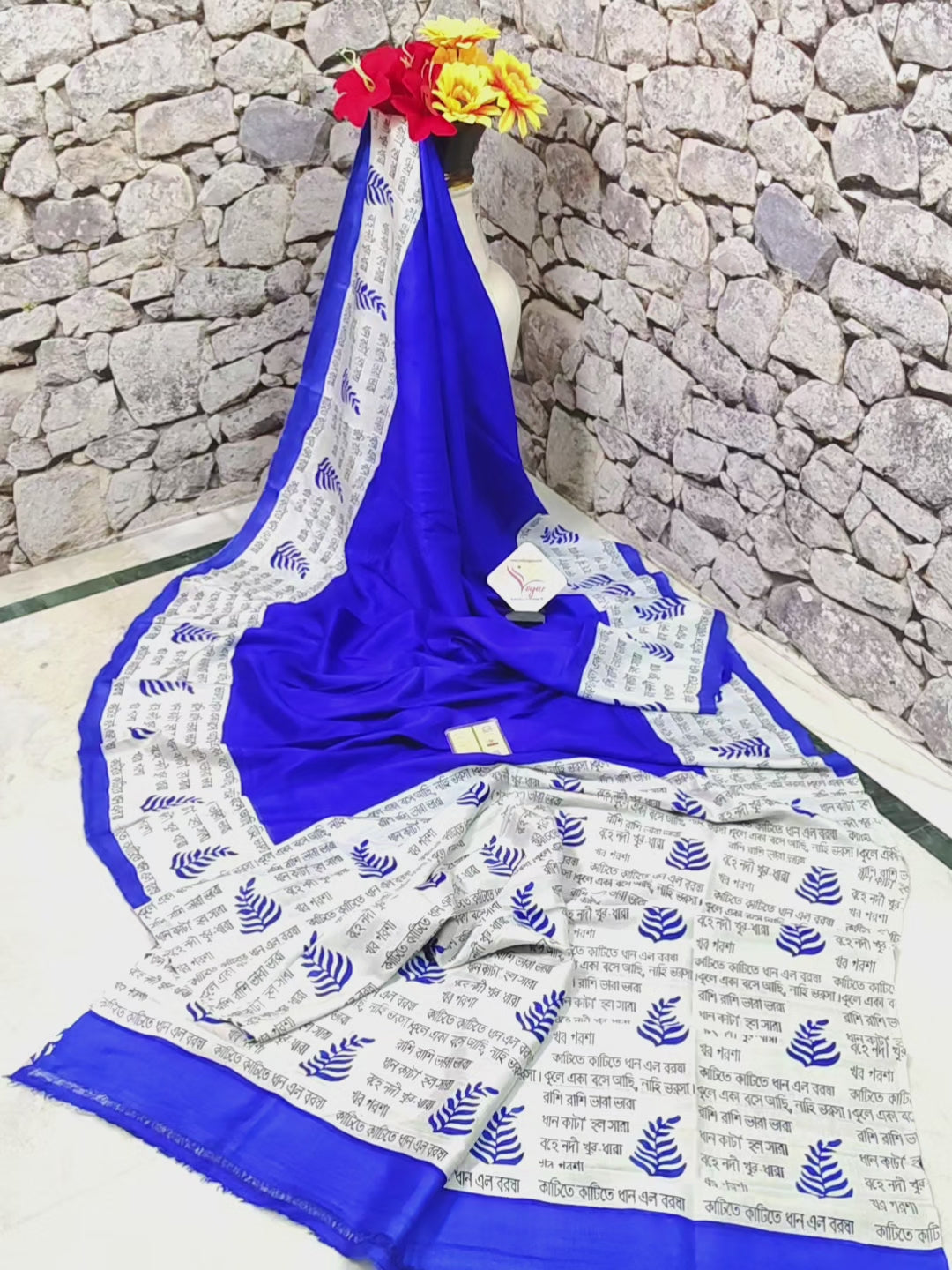 Wrap yourself in tradition with this exquisite ultramarine blue color Bishnupur silk saree. The distinctive script print using letter blocks adorning both the border and the anchal (pallu) adds a touch of artistic elegance.