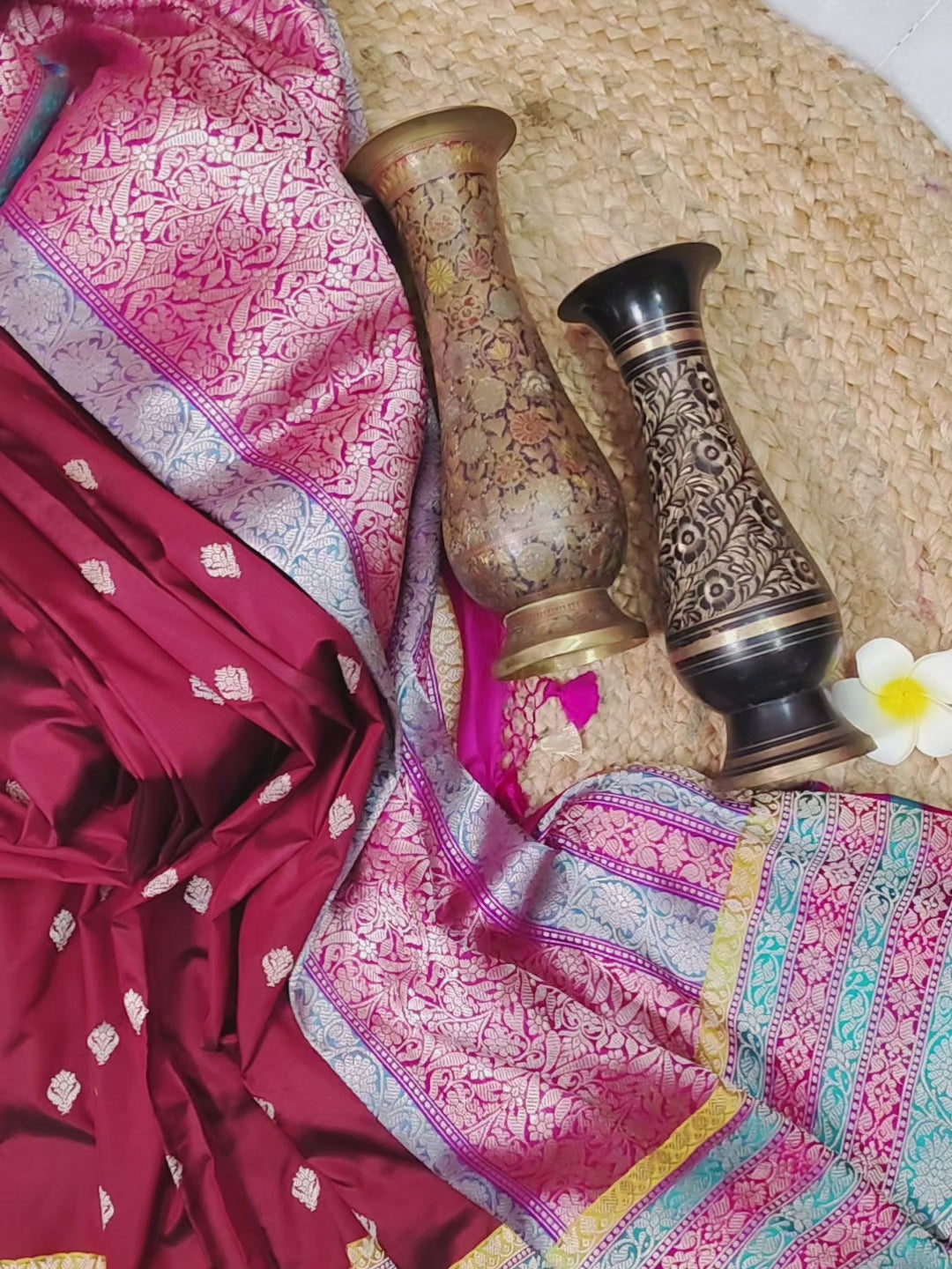 Wine Color Pure Katan Banarasi Silk Saree with Multicolor Zari Border