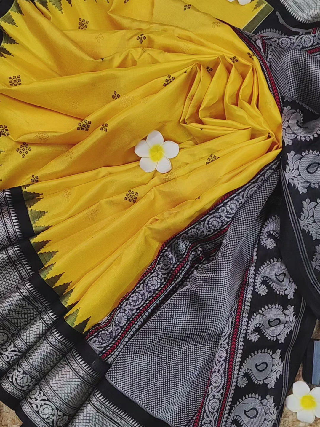 The body is in yellow woven silk thread with resham butis. The black colored temple border and the contrast pallu have been woven beautifully in resham/silk thread.